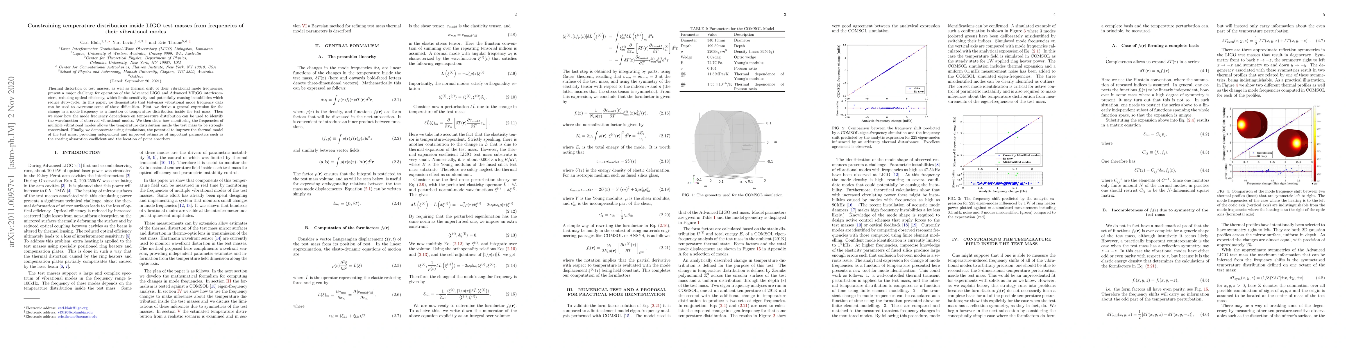 Thermal distortion of test masses, as well as thermal drift of their vibrational mode frequencies, present a major challenge for operation of the Advanced LIGO and Advanced VIRGO interferometers, reducing optical efficiency, which limits sensitivity and potentially causing instabilities which reduce duty-cycle. In this paper, we demonstrate that test-mass vibrational mode frequency data can be used to overcome some of these difficulties. First, we derive a general expression for the change in a mode frequency as a function of temperature distribution inside the test mass. Then we show how the mode frequency dependence on temperature distribution can be used to identify the wavefunction of observed vibrational modes. We then show how monitoring the frequencies of multiple vibrational modes allows the temperature distribution inside the test mass to be strongly constrained. Finally, we demonstrate using simulations, the potential to improve the thermal model of the test mass, providing independent and improved estimates of important parameters such as the coating absorption coefficient and the location of point absorbers.