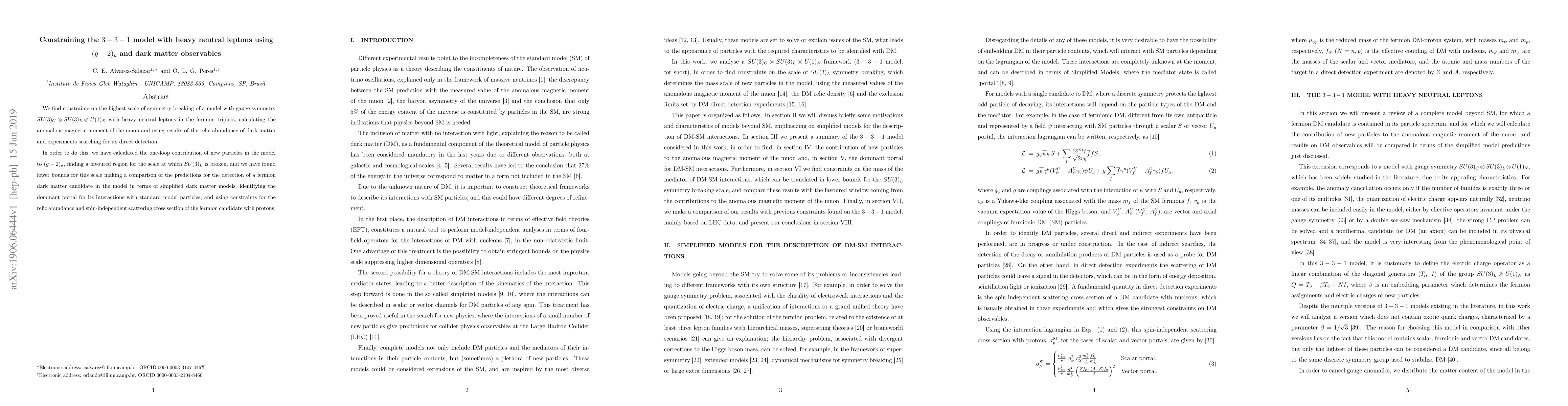 We find constraints on the highest scale of symmetry breaking of a model with gauge symmetry $SU(3)_C \otimes SU(3)_L \otimes U(1)_X$ with heavy neutral leptons in the fermion triplets, calculating the anomalous magnetic moment of the muon and using results of the relic abundance of dark matter and experiments searching for its direct detection. In order to do this, we have calculated the one-loop contribution of new particles in the model to $(g-2)_{\mu}$, finding a favoured region for the scale at which $SU(3)_L$ is broken, and we have found lower bounds for this scale making a comparison of the predictions for the detection of a fermion dark matter candidate in the model in terms of simplified dark matter models, identifying the dominant portal for its interactions with standard model particles, and using constraints for the relic abundance and spin-independent scattering cross section of the fermion candidate with protons.