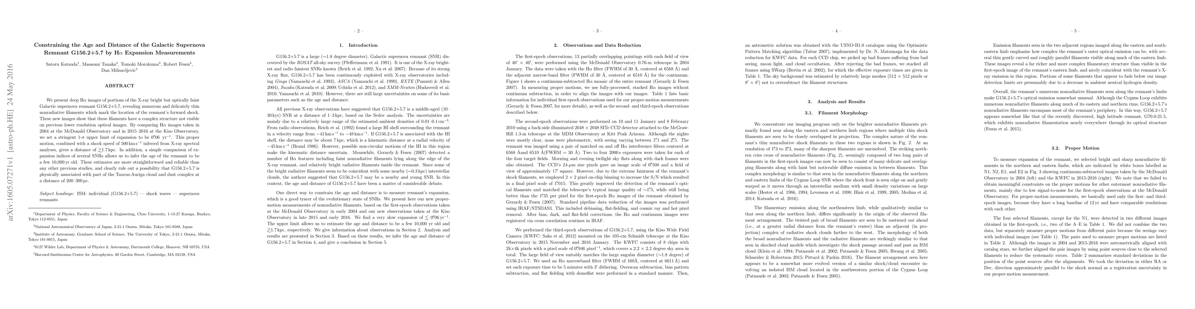 We present deep H-alpha images of portions of the X-ray bright but optically faint Galactic supernova remnant G156.2+5.7, revealing numerous and delicately thin nonradiative filaments which mark the location of the remnant's forward shock. These new images show that these filaments have a complex structure not visible on previous lower resolution optical images. By comparing H-alpha images taken in 2004 at the McDonald Observatory and in 2015-2016 at the Kiso Observatory, we set a stringent 1-sigma upper limit of expansion to be 0.06 arcsec/yr. This proper motion, combined with a shock speed of 500 km/s inferred from X-ray spectral analyses, gives a distance of > 1.7 kpc. In addition, a simple comparison of expansion indices of several SNRs allows us to infer the age of the remnant to be a few 10,000 yr old. These estimates are more straightforward and reliable than any other previous studies, and clearly rule out a possibility that G156.2+5.7 is physically associated with part of the Taurus-Auriga cloud and dust complex at a distance of 200-300 pc.