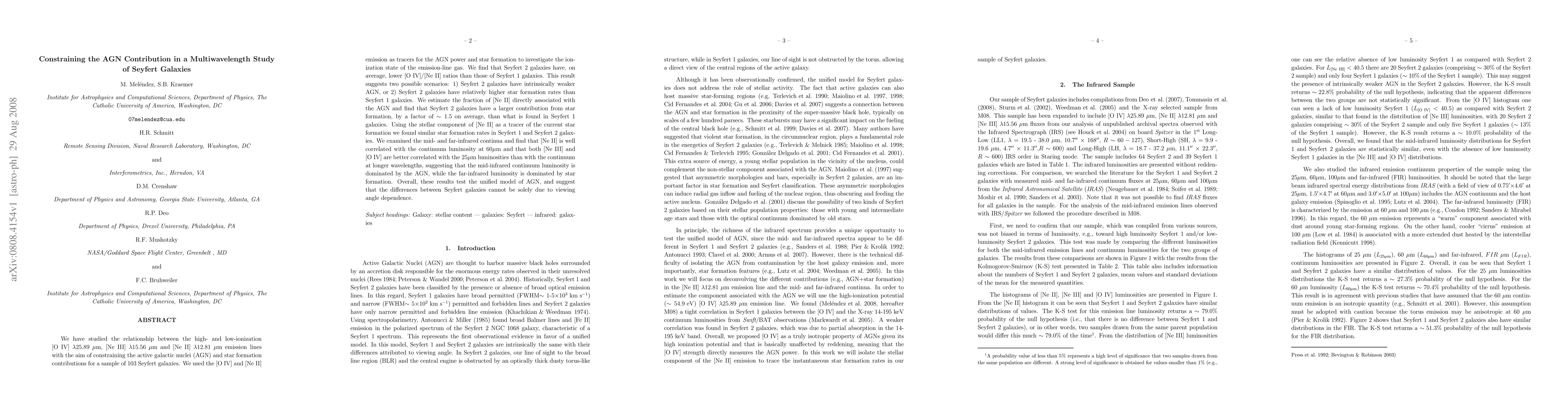 This study investigates the contributions of AGN and star formation in 103 Seyfert galaxies using mid-infrared emission lines. It finds that Seyfert 2 galaxies have relatively higher star formation rates compared to Seyfert 1 galaxies, challenging the unified model of AGN.