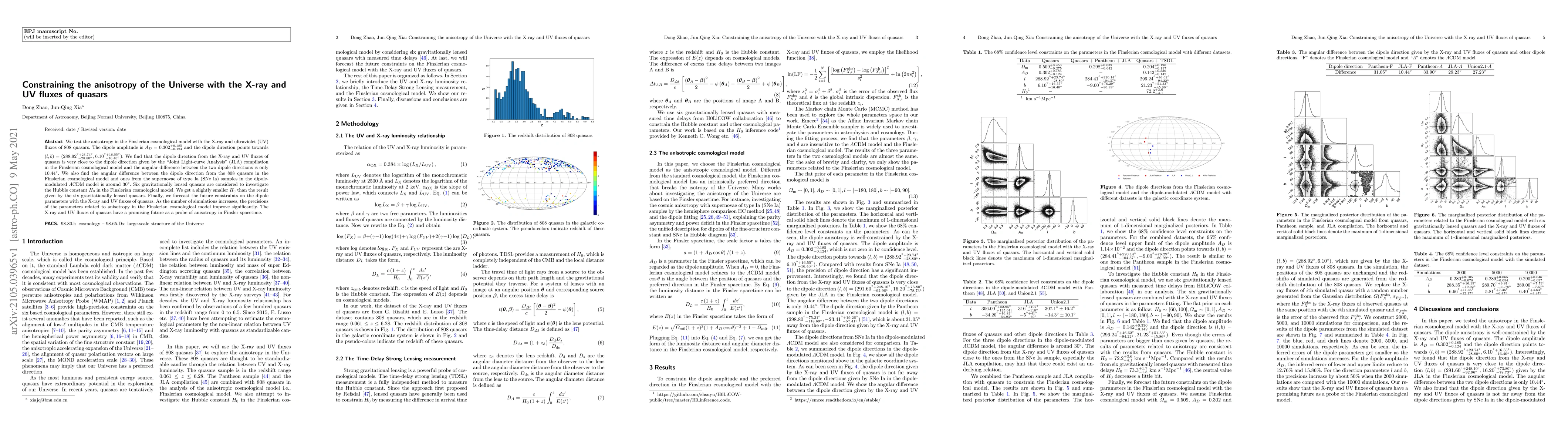 We test the anisotropy in the Finslerian cosmological model with the X-ray and ultraviolet (UV) fluxes of 808 quasars. The dipole amplitude is $A_D=0.302_{ -0.124}^{ +0.185}$ and the dipole direction points towards $(l, b) = ( 288.92_{~ -28.80^{\circ}}^{^{\circ}+23.74^{\circ}}, 6.10_{~ -16.40^{\circ}}^{^{\circ} +16.55^{\circ}} )$. We find that the dipole direction from the X-ray and UV fluxes of quasars is very close to the dipole direction given by the "Joint Light-curve Analysis" (JLA) compilation in the Finslerian cosmological model and the angular difference between the two dipole directions is only $10.44^{\circ}$. We also find the angular difference between the dipole direction from the 808 quasars in the Finslerian cosmological model and ones from the supernovae of type Ia (SNe Ia) samples in the dipole-modulated $\Lambda$CDM model is around $30^{\circ}$. Six gravitationally lensed quasars are considered to investigate the Hubble constant $H_0$ in the Finslerian cosmological model. We get a slightly smaller $H_0$ than the result given by the six gravitationally lensed quasars. Finally, we forecast the future constraints on the dipole parameters with the X-ray and UV fluxes of quasars. As the number of simulations increases, the precisions of the parameters related to anisotropy in the Finslerian cosmological model improve significantly. The X-ray and UV fluxes of quasars have a promising future as a probe of anisotropy in Finsler spacetime.