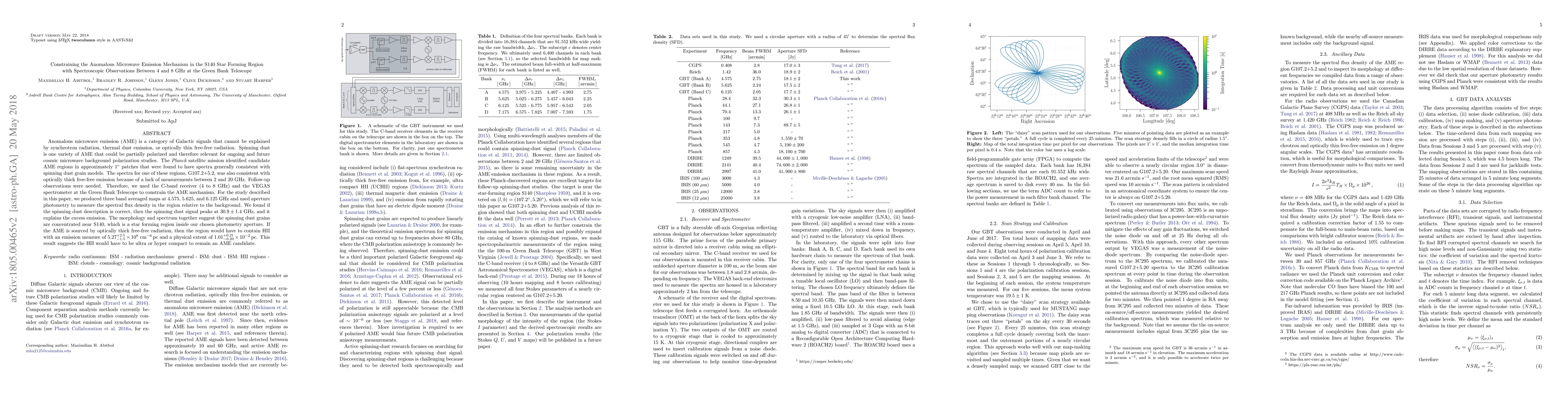 Anomalous microwave emission (AME) is a category of Galactic signals that cannot be explained by synchrotron radiation, thermal dust emission, or optically thin free-free radiation. Spinning dust is one variety of AME that could be partially polarized and therefore relevant for ongoing and future cosmic microwave background polarization studies. The Planck satellite mission identified candidate AME regions in approximately $1^\circ$ patches that were found to have spectra generally consistent with spinning dust grain models. The spectra for one of these regions, G107.2+5.2, was also consistent with optically thick free-free emission because of a lack of measurements between 2 and 20 GHz. Follow-up observations were needed. Therefore, we used the C-band receiver (4 to 8 GHz) and the VEGAS spectrometer at the Green Bank Telescope to constrain the AME mechanism. For the study described in this paper, we produced three band averaged maps at 4.575, 5.625, and 6.125 GHz and used aperture photometry to measure the spectral flux density in the region relative to the background. We found if the spinning dust description is correct, then the spinning dust signal peaks at $30.9 \pm 1.4$ GHz, and it explains the excess emission. The morphology and spectrum together suggest the spinning dust grains are concentrated near S140, which is a star forming region inside our chosen photometry aperture. If the AME is sourced by optically thick free-free radiation, then the region would have to contain HII with an emission measure of $5.27^{+2.5}_{-1.5}\times 10^8$ $\rm{cm^{-6}\,pc}$ and a physical extent of $1.01^{+0.21}_{-0.20} \times 10^{-2}\,\rm{pc}$. This result suggests the HII would have to be ultra or hyper compact to remain an AME candidate.
