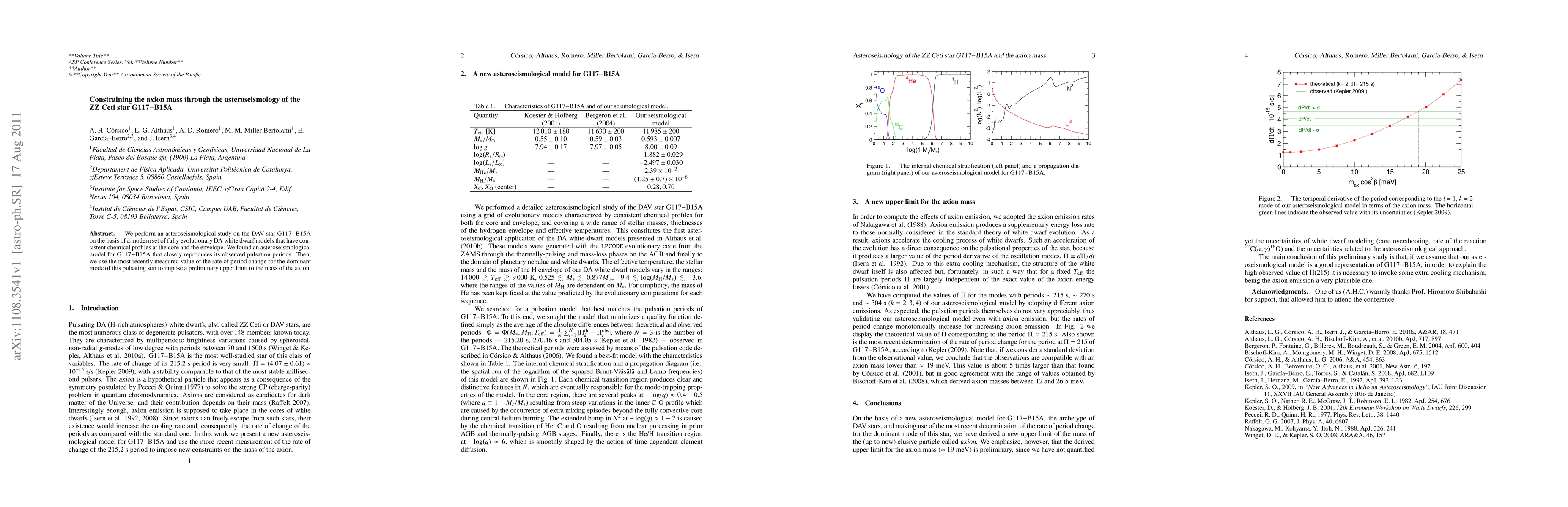 We perform an asteroseismological study on the DAV star G117-B15A on the basis of a modern set of fully evolutionary DA white dwarf models that have consistent chemical profiles at the core and the envelope. We found an asteroseismological model for G117-B15A that closely reproduces its observed pulsation periods. Then, we use the most recently measured value of the rate of period change for the dominant mode of this pulsating star to impose a preliminary upper limit to the mass of the axion.