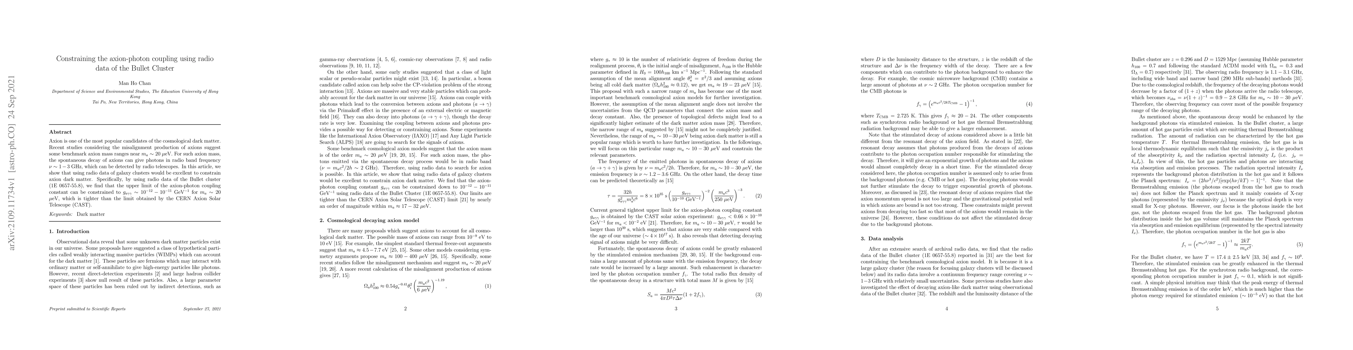 Axion is one of the most popular candidates of the cosmological dark matter. Recent studies considering the misalignment production of axions suggest some benchmark axion mass ranges near $m_a \sim 20$ $\mu$eV. For such axion mass, the spontaneous decay of axions can give photons in radio band frequency $\nu \sim 1-3$ GHz, which can be detected by radio telescopes. In this article, we show that using radio data of galaxy clusters would be excellent to constrain axion dark matter. Specifically, by using radio data of the Bullet cluster (1E 0657-55.8), we find that the upper limit of the axion-photon coupling constant can be constrained to $g_{a \gamma \gamma} \sim 10^{-12}-10^{-11}$ GeV$^{-1}$ for $m_a \sim 20$ $\mu$eV, which is tighter than the limit obtained by the CERN Axion Solar Telescope (CAST).