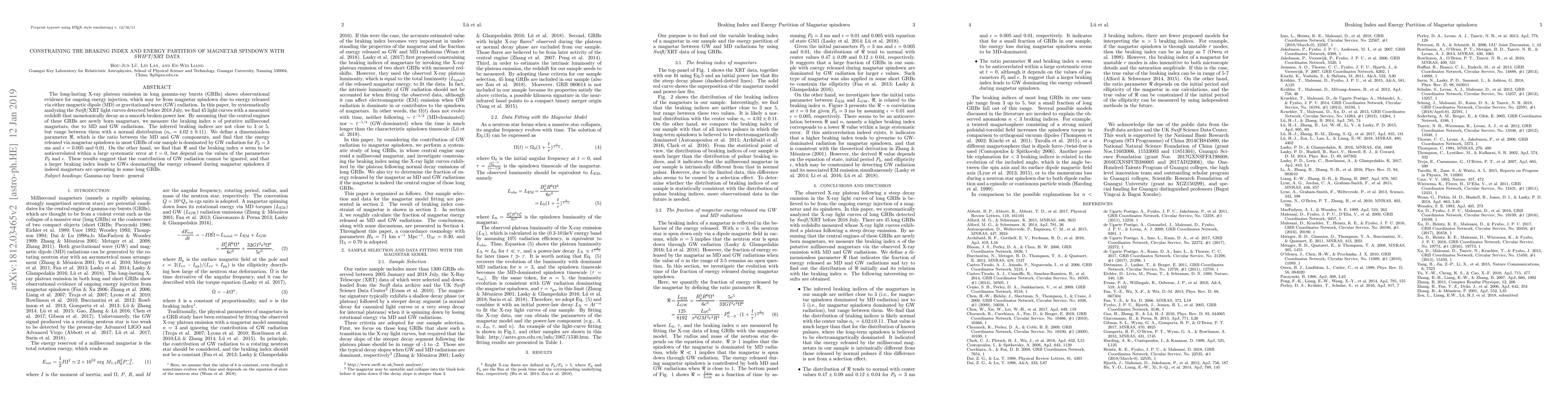 The long-lasting X-ray plateau emission in long gamma-ray bursts (GRBs) shows observational evidence for ongoing energy injection, which may be from magnetar spindown due to energy released via either magnetic dipole (MD) or gravitational wave (GW) radiation. In this paper, by systematically analyzing the {\em Swift}/XRT light curves detected before 2018 July, we find 45 light curves with a measured redshift that monotonically decay as a smooth broken power law. By assuming that the central engines of these GRBs are newly born magnetars, we measure the braking index $n$ of putative millisecond magnetars, due to MD and GW radiations. The inferred braking indices are not close to 3 or 5, but range between them with a normal distribution ($n_{\rm c}=4.02\pm 0.11$). We define a dimensionless parameter $\Re$, which is the ratio between the MD and GW components, and find that the energy released via magnetar spindown in most GRBs of our sample is dominated by GW radiation for $P_0=3$ ms and $\epsilon=0.005$ and 0.01. On the other hand, we find that $\Re$ and the braking index $n$ seem to be anticorrelated within a large systematic error at $t=0$, but depend on the values of the parameters $P_0$ and $\epsilon$. These results suggest that the contribution of GW radiation cannot be ignored, and that a larger braking index leads to GWs dominating the energy released during magnetar spindown if indeed magnetars are operating in some long GRBs.