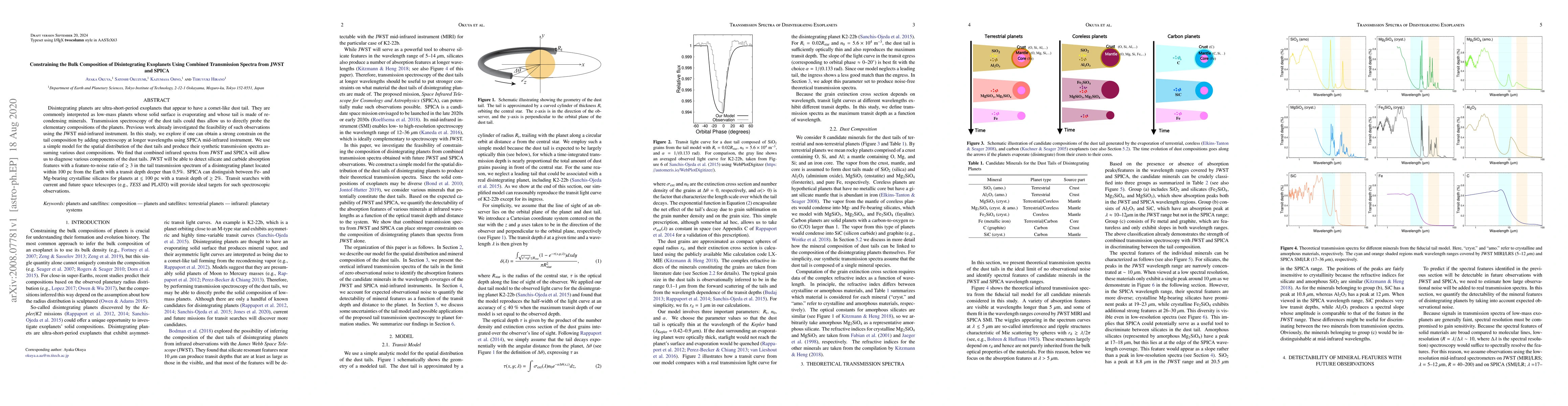 This study investigates the use of combined transmission spectroscopy from JWST and SPICA to constrain the bulk composition of disintegrating exoplanets. It finds that JWST can detect silicate and carbide features, while SPICA can distinguish between Fe- and Mg-silicates, providing a comprehensive analysis of the dust tails.