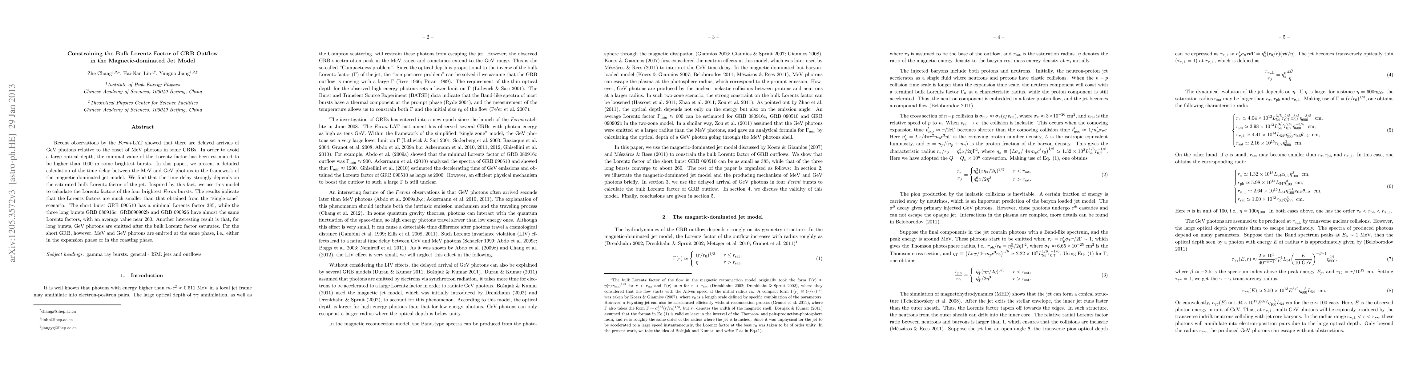 This paper investigates the bulk Lorentz factor of GRB outflows using a magnetic-dominated jet model, finding that the time delay between MeV and GeV photons depends on the jet's Lorentz factor. The calculated Lorentz factors for the brightest Fermi bursts are significantly lower than previously estimated, with values around 260 for long bursts and 385 for the short GRB 090510.