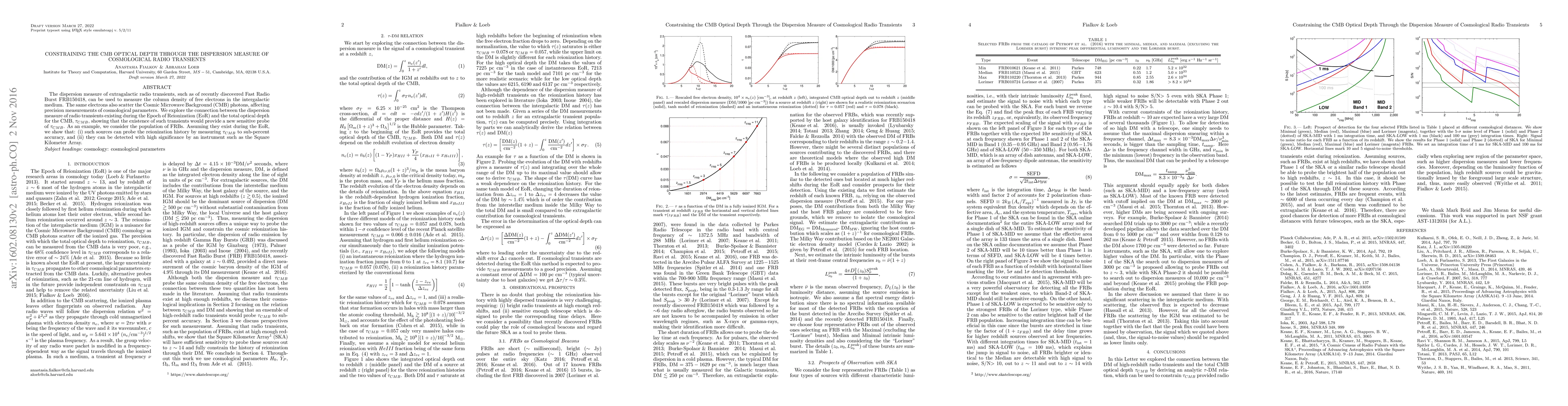 The dispersion measure of extragalactic radio transients, such as of recently discovered Fast Radio Burst FRB150418, can be used to measure the column density of free electrons in the intergalactic medium. The same electrons also scatter the Cosmic Microwave Background (CMB) photons, affecting precision measurements of cosmological parameters. We explore the connection between the dispersion measure of radio transients existing during the Epoch of Reionization (EoR) and the total optical depth for the CMB, $\tau_{CMB}$, showing that the existence of such transients would provide a new sensitive probe of $\tau_{CMB}$. As an example, we consider the population of FRBs. Assuming they exist during the EoR, we show that: (i) such sources can probe the reionization history by measuring $\tau_{CMB}$ to sub-percent accuracy, and (ii) they can be detected with high significance by an instrument such as the Square Kilometer Array.