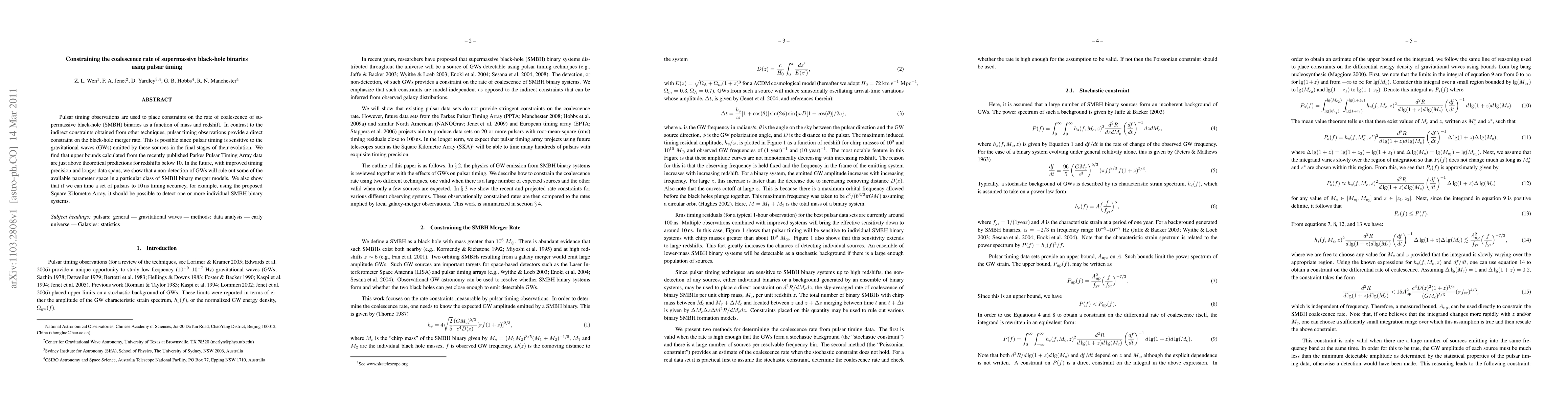 This paper uses pulsar timing observations to directly constrain the coalescence rate of supermassive black-hole binaries, finding upper bounds just above theoretical predictions for redshifts below 10. Future improvements in timing precision may rule out some merger models, and higher accuracy could detect individual SMBH binaries.