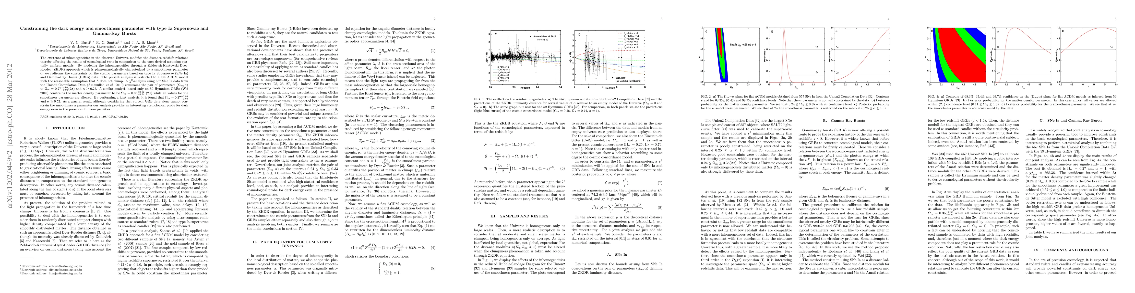 The existence of inhomogeneities in the observed Universe modifies the distance-redshift relations thereby affecting the results of cosmological tests in comparison to the ones derived assuming spatially uniform models. By modeling the inhomogeneities through a Zeldovich-Kantowski-Dyer-Roeder (ZKDR) approach which is phenomenologically characterized by a smoothness parameter $\alpha$, we rediscuss the constraints on the cosmic parameters based on Supernovae type Ia and Gamma-Ray Bursts (GRBs) data. The present analysis is restricted to a flat $\Lambda$CDM model with the reasonable assumption that $\Lambda$ does not clump. A $\chi^{2}$-analysis using 557 SNe Ia data from the Union2 Compilation Data (Amanullah {\it et al.} 2010) constrains the pair of parameters ($\Omega_m, \alpha$) to $\Omega_m=0.27_{-0.03}^{+0.08}$($2\sigma$) and $\alpha \geq 0.25$. A similar analysis based only on 59 Hymnium GRBs (Wei 2010) constrains the matter density parameter to be $\Omega_m= 0.35^{+0.62}_{-0.24}$ ($2\sigma$) while all values for the smoothness parameter are allowed. By performing a joint analysis, it is found that $\Omega_m = 0.27^{+0.06}_{-0.03}$ and $\alpha \geq 0.52$. As a general result, although considering that current GRB data alone cannot constrain the smoothness $\alpha$ parameter our analysis provides an interesting cosmological probe for dark energy even in the presence of inhomogeneities.