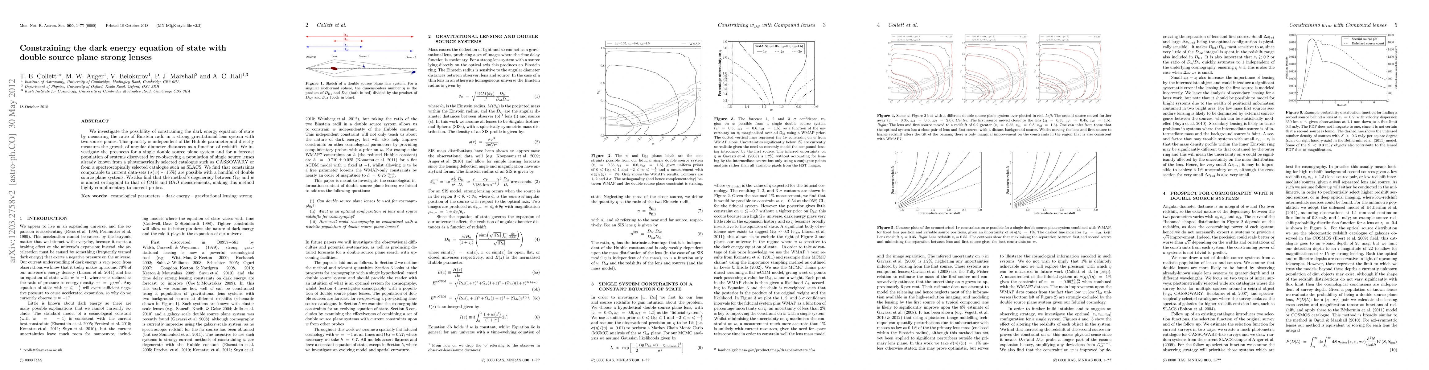 This paper explores the potential of double source plane strong gravitational lenses to constrain the dark energy equation of state, finding that a few such systems could yield constraints comparable to current datasets. The method's orthogonality to CMB and BAO measurements suggests it complements existing probes effectively.