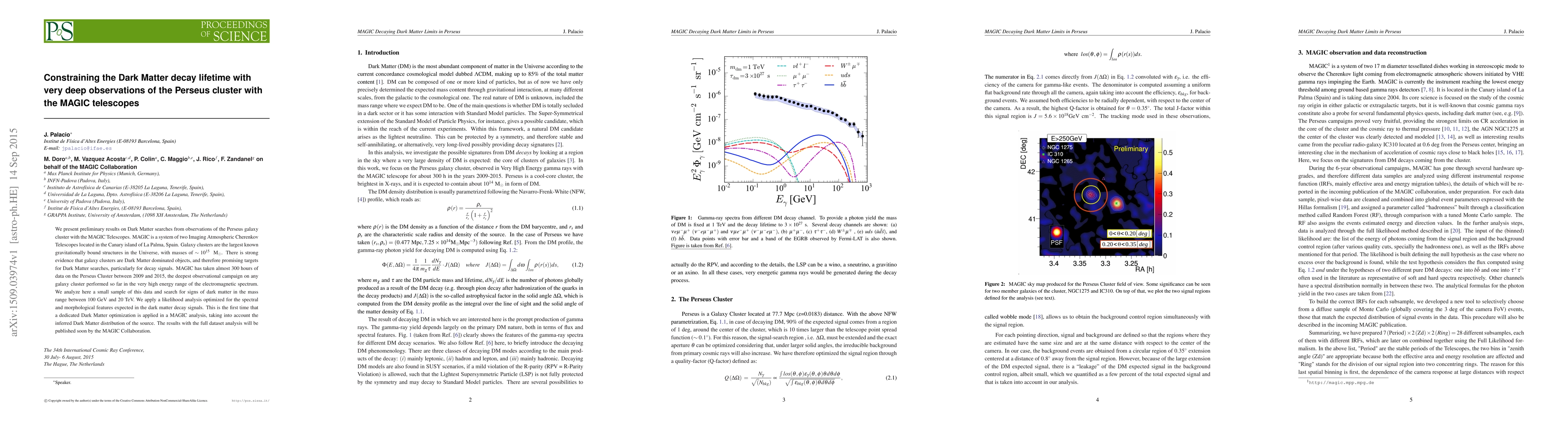 This paper reports preliminary findings from the MAGIC Telescopes' deep observations of the Perseus galaxy cluster, aiming to constrain the decay lifetime of Dark Matter. The analysis, optimized for dark matter decay signals, utilized nearly 300 hours of data, marking the deepest observational campaign in the very high energy spectrum to date.