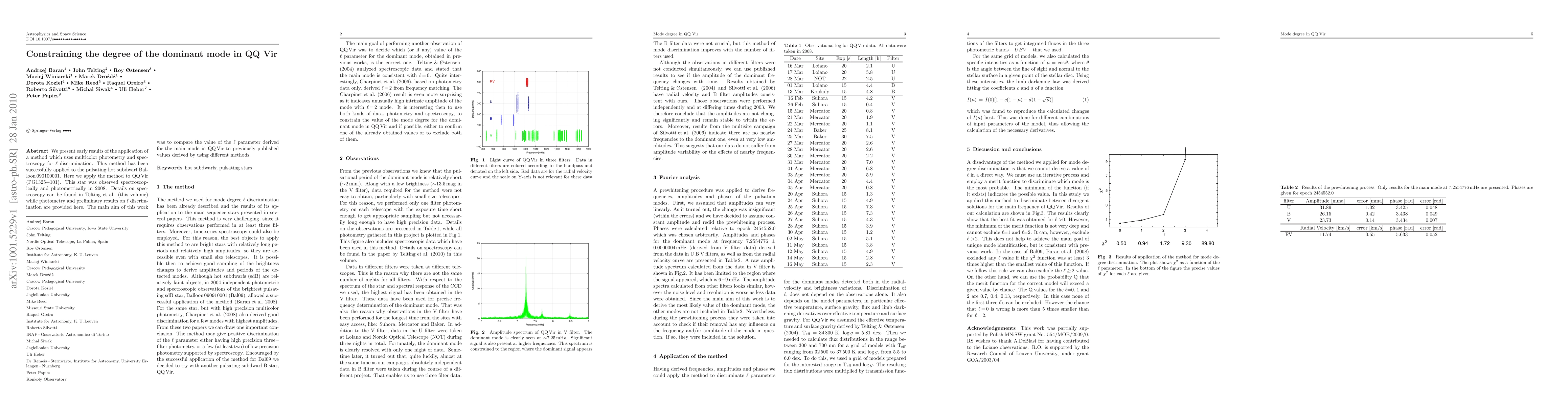 We present early results of the application of a method which uses multicolor photometry and spectroscopy for \ell discrimination. This method has been successfully applied to the pulsating hot subdwarf Balloon 090100001. Here we apply the method to QQ Vir (PG1325+101). This star was observed spectroscopically and photometrically in 2008. Details on spectroscopy can be found in Telting et al. (2010) while photometry and preliminary results on \ell discrimination are provided here. The main aim of this work was to compare the value of the \ell parameter derived for the main mode in QQ Vir to previously published values derived by using different methods.