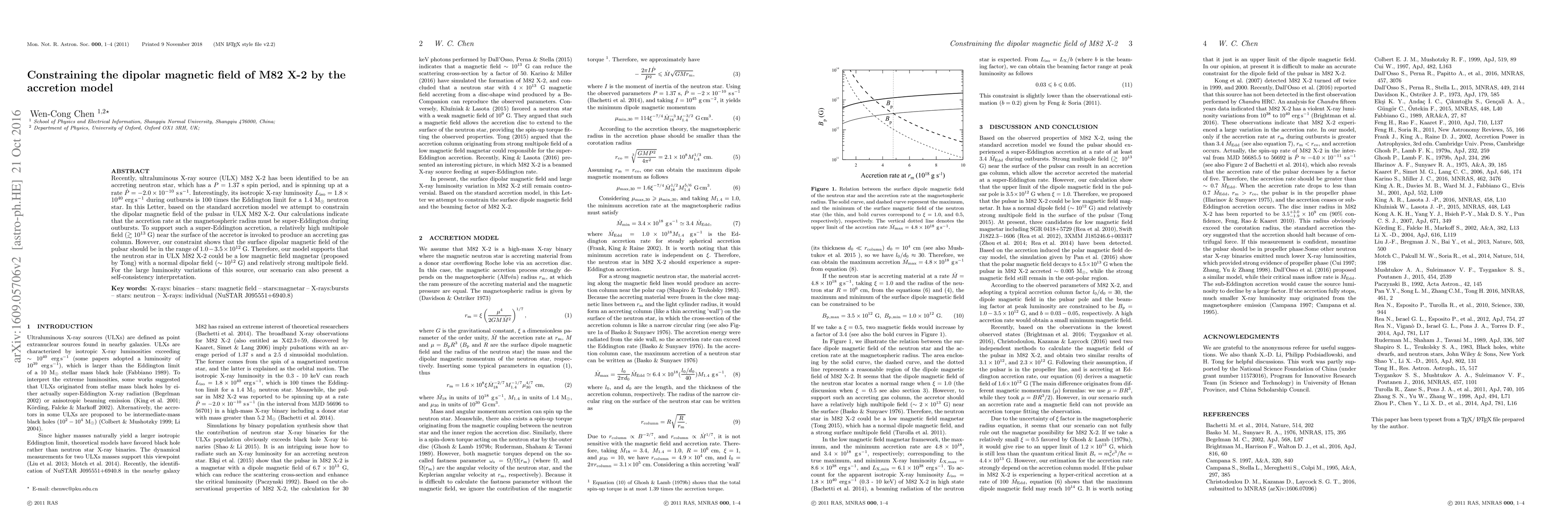 Recently, ultraluminous X-ray source (ULX) M82 X-2 has been identified to be an accreting neutron star, which has a $P=1.37$ s spin period, and is spinning up at a rate $\dot{P}=-2.0\times 10^{-10}~\rm s\,s^{-1}$. Interestingly, its isotropic X-ray luminosity $L_{\rm iso}=1.8\times 10^{40}~\rm erg\,s^{-1}$ during outbursts is 100 times the Eddington limit for a $1.4~\rm M_{\odot}$ neutron star. In this Letter, based on the standard accretion model we attempt to constrain the dipolar magnetic field of the pulsar in ULX M82 X-2. Our calculations indicate that the accretion rate at the magnetospheric radius must be super-Eddington during outbursts. To support such a super-Eddington accretion, a relatively high multipole field ($\ga 10^{13}$ G) near the surface of the accretor is invoked to produce an accreting gas column. However, our constraint shows that the surface dipolar magnetic field of the pulsar should be in the range of $1.0-3.5\times 10^{12}$ G. Therefore, our model supports that the neutron star in ULX M82 X-2 could be a low magnetic field magnetar (proposed by Tong) with a normal dipolar field ($\sim 10^{12}$ G) and relatively strong multipole field. For the large luminosity variations of this source, our scenario can also present a self-consistency interpretation.