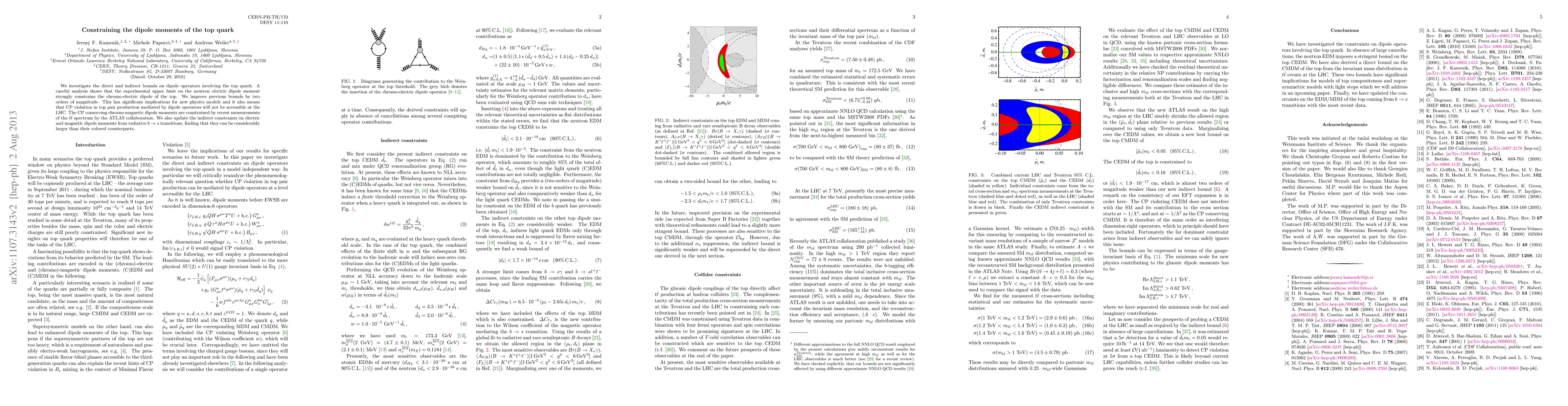 This paper investigates the constraints on dipole operators involving the top quark, significantly improving previous bounds by two orders of magnitude through analysis of the neutron electric dipole moment and recent ATLAS measurements. These findings limit CP-violating effects in top pair production and suggest larger indirect constraints on the electric dipole moments from radiative b -> s transitions.