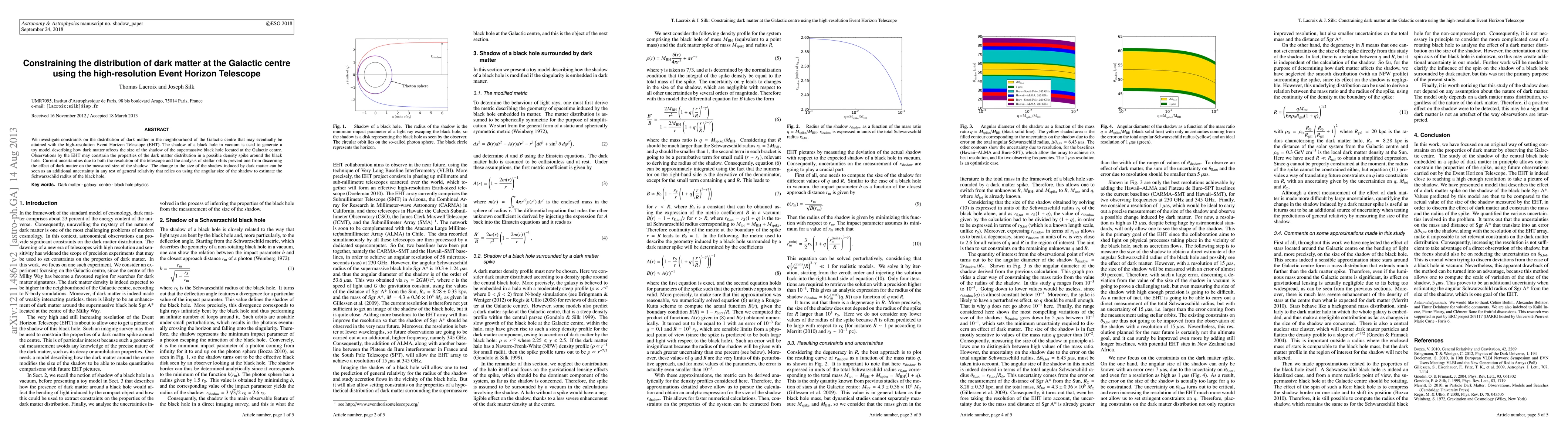 We investigate constraints on the distribution of dark matter in the neighbourhood of the Galactic centre that may eventually be attained with the high-resolution Event Horizon Telescope (EHT). The shadow of a black hole in vacuum is used to generate a toy model describing how dark matter affects the size of the shadow of the supermassive black hole located at the Galactic centre. Observations by the EHT may constrain the properties of the dark matter distribution in a possible density spike around the black hole. Current uncertainties due to both the resolution of the telescope and the analysis of stellar orbits prevent one from discerning the effect of dark matter on the measured size of the shadow. The change in the size of the shadow induced by dark matter can be seen as an additional uncertainty in any test of general relativity that relies on using the angular size of the shadow to estimate the Schwarzschild radius of the black hole.