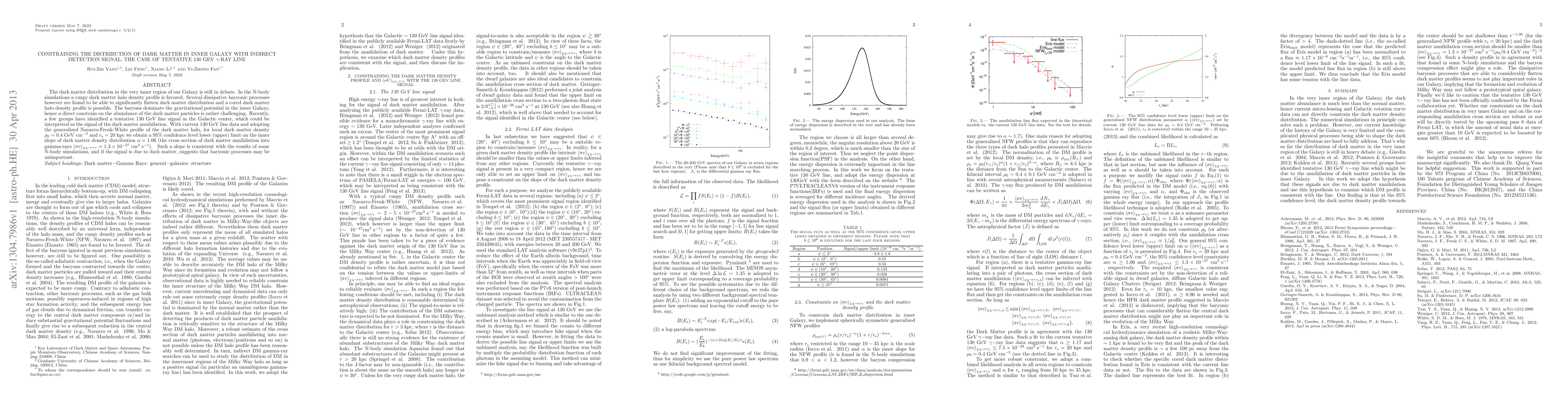 The dark matter distribution in the very inner region of our Galaxy is still in debate. In the N-body simulations a cuspy dark matter halo density profile is favored. Several dissipative baryonic processes however are found to be able to significantly flatten dark matter distribution and a cored dark matter halo density profile is possible. The baryons dominate the gravitational potential in the inner Galaxy, hence a direct constrain on the abundance of the dark matter particles is rather challenging. Recently, a few groups have identified a tentative 130 GeV line signal in the Galactic center, which could be interpreted as the signal of the dark matter annihilation. With current 130 GeV line data and adopting the generalized Navarro-Frenk-White profile of the dark matter halo, for local dark matter density \rho_0=0.4 GeV cm^{-3} and r_s=20 kpc we obtain a 95% confidence level lower (upper) limit on the inner slope of dark matter density distribution \alpha = 1.06 (the cross section of dark matter annihilation into gamma-rays <\sigma v >_{\chi\chi -> \gamma\gamma}= 1.3\times 10^{-27} cm^3 s^{-1}). Such a slope is consistent with the results of some N-body simulations, and if the signal is due to dark matter, suggests that baryonic processes may be unimportant.