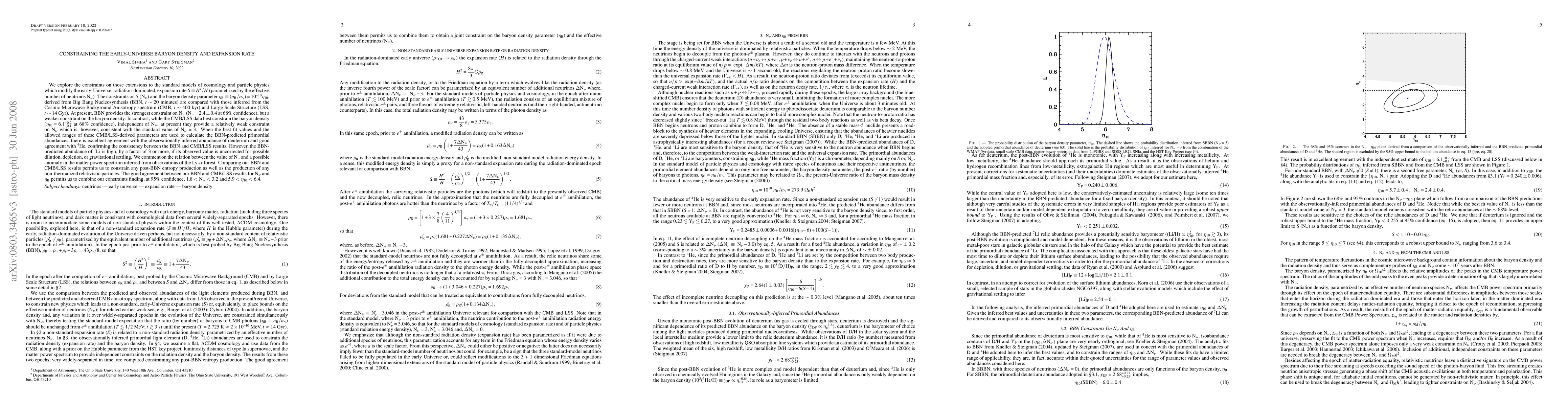 We explore constraints on extensions to the standard models of cosmology and particle physics which modify the early-Universe expansion rate S = H'/H (parametrized by the effective number of neutrinos N_nu). The constraints on N_nu and the baryon density parameter (eta_B = n_B/n_gamma = 10^(-10)*eta_10) from BBN at 20 minutes are compared with those from the CMB at 400 kyr and LSS at 14 Gyr. BBN provides the strongest constraint on N_nu (1.6 < N_nu < 3.3 at 95% confidence), but a weaker constraint on eta_B. The CMB/LSS best constrain the baryon density (5.9 < eta_10 < 6.4 at 95% confidence), independent of N_nu, but provide a relatively weak N_nu constraint, consistent with N_nu = 3. Using the best fit values and the allowed ranges of the CMB/LSS-derived parameters to calculate the BBN-predicted primordial abundances yields excellent agreement with the observationally inferred abundance of deuterium and good agreement with 4He, confirming the consistency between the BBN and CMB/LSS results. However, the BBN-predicted abundance of 7Li is high, by a factor of 3 or more. We comment on the value of N_nu and a possible anomaly in the matter power spectrum inferred from observations of the Ly-alpha forest. The good agreement between our BBN and CMB/LSS results permit us to constrain any post-BBN entropy production as well as to limit the production of any non-thermalized relativistic particles and, allow us to combine them finding 95% ranges, 1.8 < N_nu < 3.2 and 5.9 < eta_10 < 6.4.