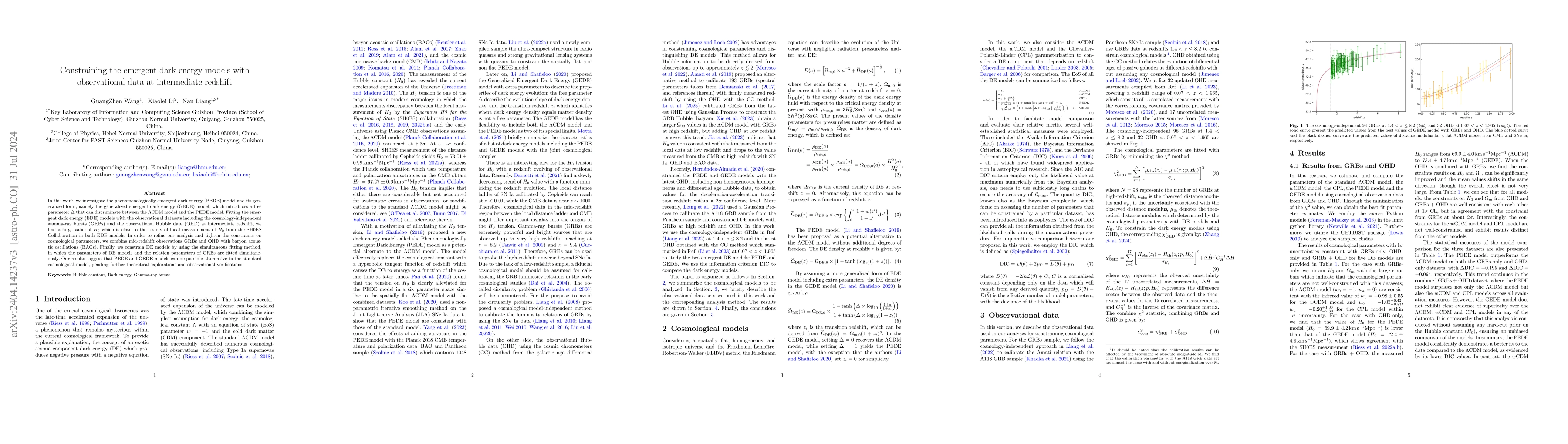 In this work, we investigate the phenomenologically emergent dark energy (PEDE) model and its generalized form, namely the generalized emergent dark energy (GEDE) model, which introduces a free parameter \unboldmath {\( \Delta \)} that can discriminate between the \unboldmath{$\mathrm{\Lambda}$}CDM model and the PEDE model. Fitting the emergent dark energy (EDE) models with the observational datasets including the cosmology-independent gamma-ray bursts (GRBs) at high-redshift and the observational Hubble data (OHD), we find a large value of $H_0$ which is close to the results of local measurement of $H_0$ from the SH0ES Collaboration in both EDE models. These results suggest that PEDE and GEDE models can %serve as an important supplement and be possible alternative to the standard cosmological model, pending further theoretical explorations and observational verifications.