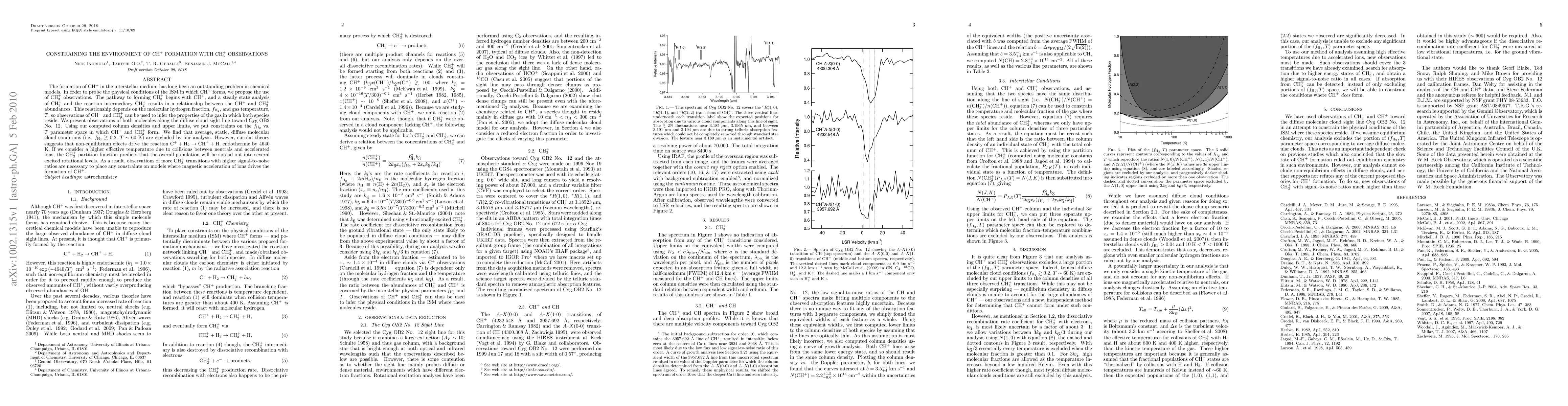 The formation of CH+ in the interstellar medium has long been an outstanding problem in chemical models. In order to probe the physical conditions of the ISM in which CH+ forms, we propose the use of CH3+ observations. The pathway to forming CH3+ begins with CH+, and a steady state analysis of CH3+ and the reaction intermediary CH2+ results in a relationship between the CH+ and CH3+ abundances. This relationship depends on the molecular hydrogen fraction, f_H2, and gas temperature, T, so observations of CH+ and CH3+ can be used to infer the properties of the gas in which both species reside. We present observations of both molecules along the diffuse cloud sight line toward Cyg OB2 No. 12. Using our computed column densities and upper limits, we put constraints on the f_H2 vs. T parameter space in which CH+ and CH3+ form. We find that average, static, diffuse molecular cloud conditions (i.e. f_H2>0.2, T~60 K) are excluded by our analysis. However, current theory suggests that non-equilibrium effects drive the reaction C+ + H_2 --> CH+ + H, endothermic by 4640 K. If we consider a higher effective temperature due to collisions between neutrals and accelerated ions, the CH3+ partition function predicts that the overall population will be spread out into several excited rotational levels. As a result, observations of more CH3+ transitions with higher signal-to-noise ratios are necessary to place any constraints on models where magnetic acceleration of ions drives the formation of CH+.