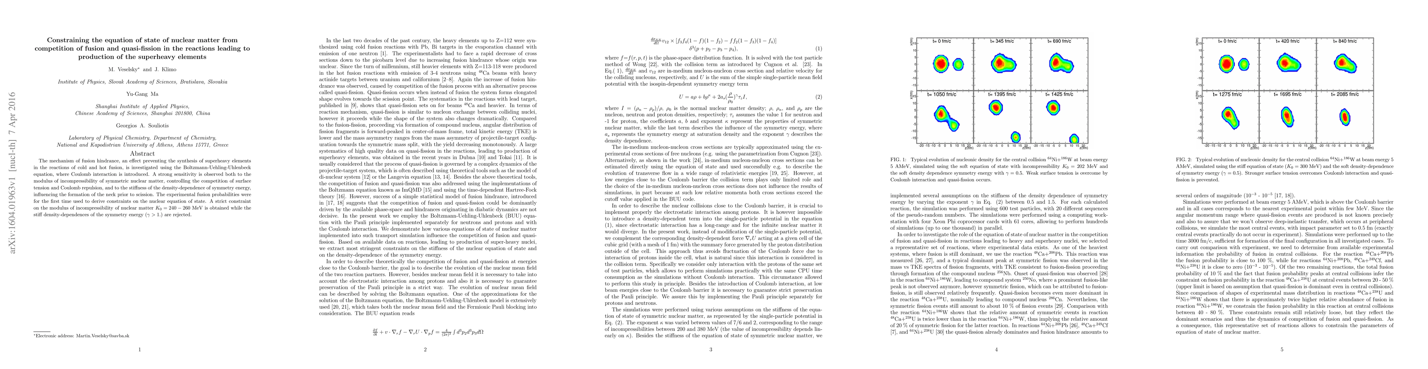 This paper investigates the fusion hindrance mechanism in superheavy element production, deriving constraints on the nuclear equation of state using experimental fusion probabilities. A strict constraint on the incompressibility of nuclear matter ($K_0 = 240 - 260$ MeV) is obtained, while stiff density-dependences of symmetry energy ($\gamma > 1$) are rejected.