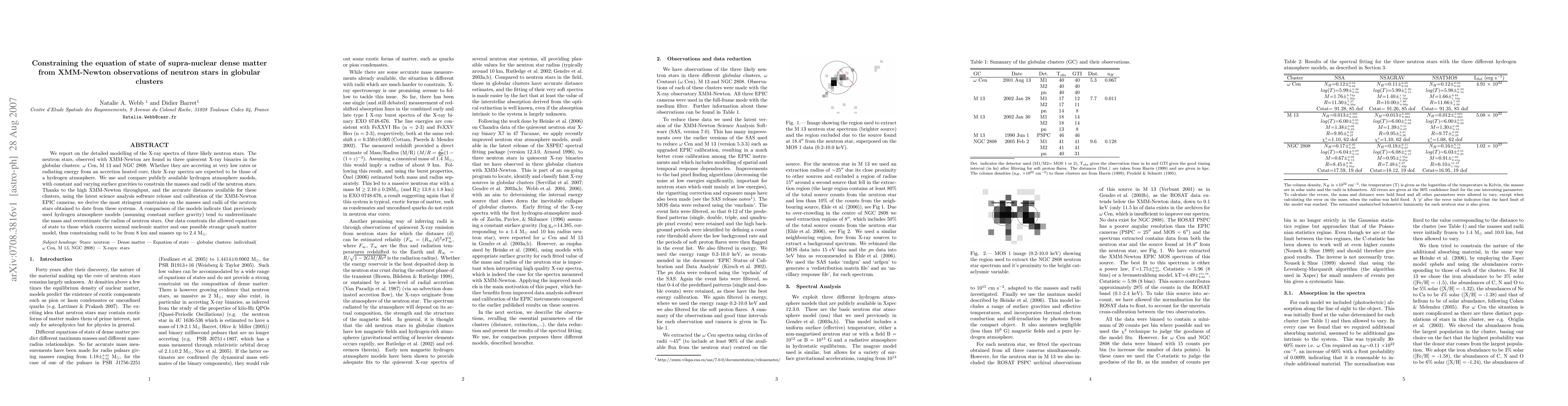 This paper uses XMM-Newton observations of neutron stars in globular clusters to model their X-ray spectra and derive stringent constraints on their masses and radii, finding that previous models underestimated mass and overestimated radius. The results constrain the equation of state to normal nucleonic matter and a possible strange quark matter model, with radii between 8 km and masses up to 2.4 M$_\odot$.