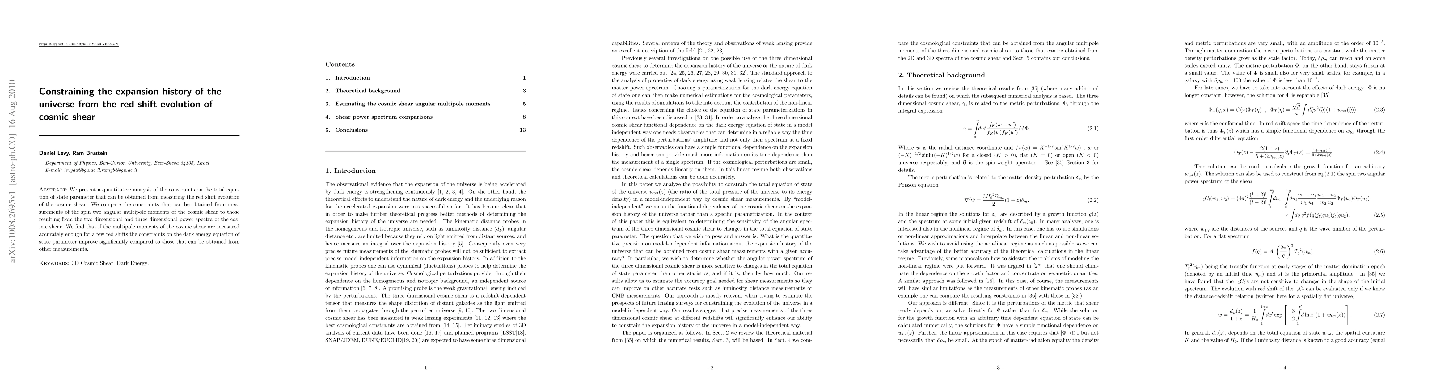 This paper quantitatively analyzes how the redshift evolution of cosmic shear can constrain the universe's expansion history, finding that precise measurements of the shear's spin two angular multipole moments yield significantly better constraints on the dark energy equation of state than traditional two-dimensional and three-dimensional power spectra.