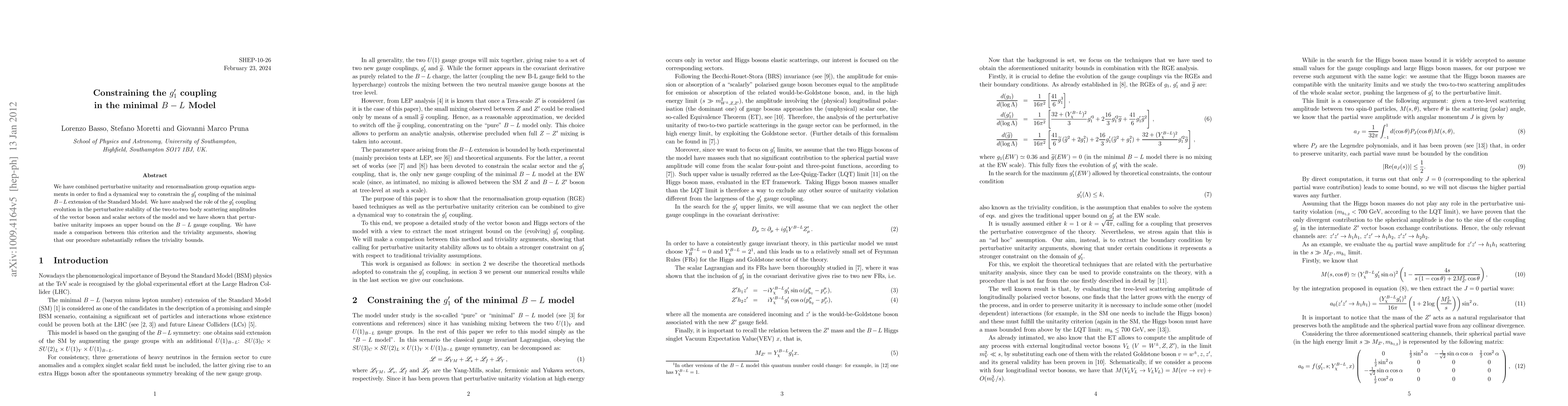 Researchers used perturbative unitarity and renormalisation group equations to constrain the $g'_1$ coupling in a minimal B-L model, finding that it imposes an upper bound on the B-L gauge coupling.