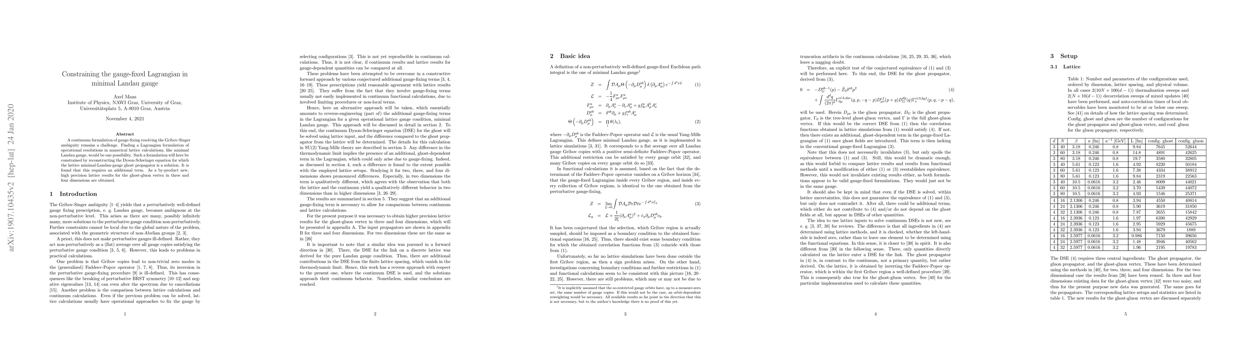This paper develops a gauge-fixed Lagrangian in the minimal Landau gauge to resolve the Gribov-Singer ambiguity in continuum formulations. It introduces an additional term to constrain the formulation, leading to high precision lattice results for the ghost-gluon vertex in three and four dimensions.