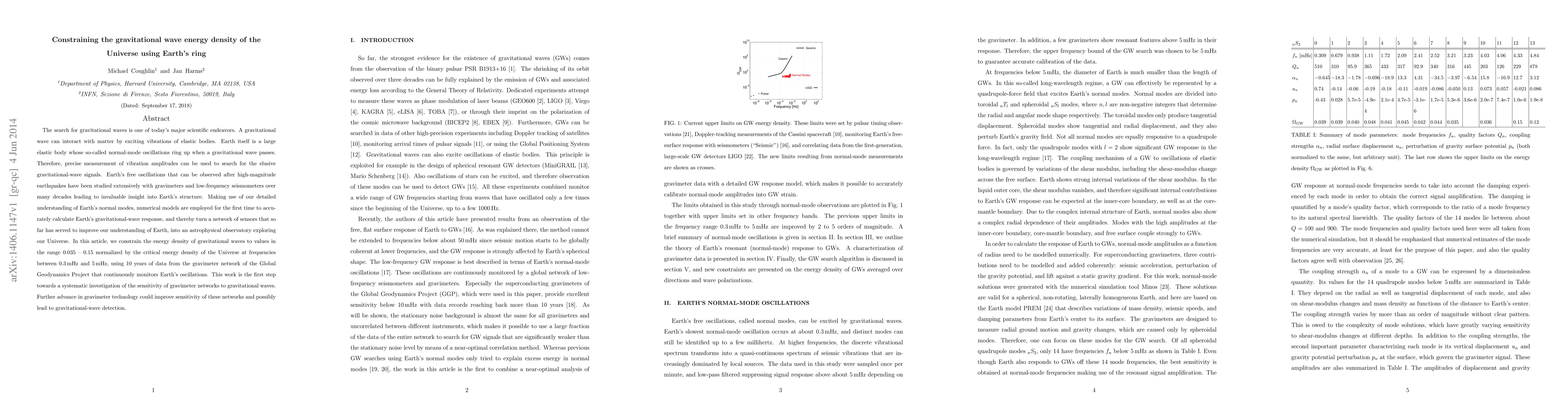 Researchers used Earth's normal-mode oscillations to constrain gravitational wave energy density to 0.035-0.15 of the universe's critical energy density in a frequency range of 0.3mHz to 5mHz.