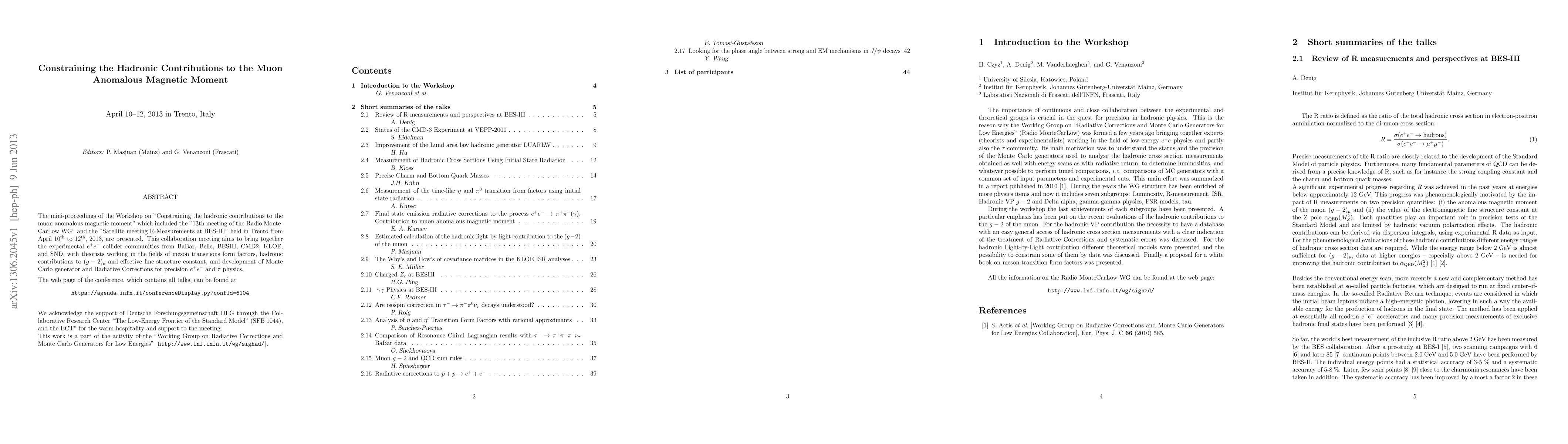 The mini-proceedings of the Workshop on "Constraining the hadronic contributions to the muon anomalous magnetic moment" which included the "13th meeting of the Radio MonteCarLow WG" and the "Satellite meeting R-Measurements at BES-III" held in Trento from April 10th to 12th, 2013, are presented. This collaboration meeting aims to bring together the experimental e+e- collider communities from BaBar, Belle, BESIII, CMD2, KLOE, and SND, with theorists working in the fields of meson transitions form factors, hadronic contributions to (g-2)_\mu and effective fine structure constant, and development of Monte Carlo generator and Radiative Corrections for precision e+e- and tau physics.