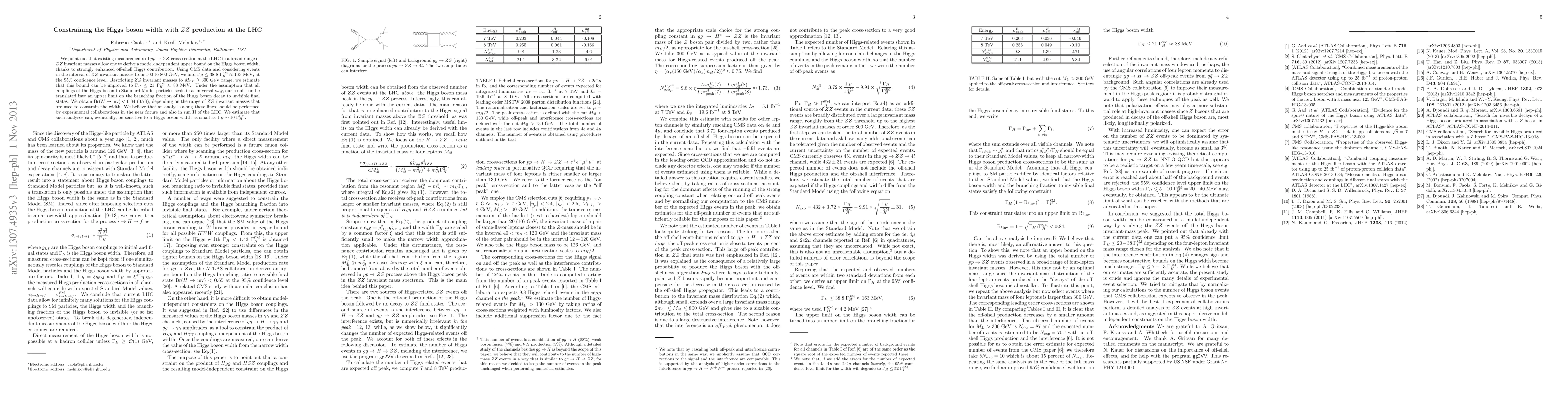 We point out that existing measurements of $pp \to ZZ$ cross-section at the LHC in a broad range of ZZ invariant masses allow one to derive a model-independent upper bound on the Higgs boson width, thanks to strongly enhanced off-shell Higgs contribution. Using CMS data and considering events in the interval of ZZ invariant masses from 100 to 800 GeV, we find $\Gamma_H \le 38.8 \times \Gamma_H^{SM} \approx 163$ MeV, at the $95\%$ confidence level. Restricting ZZ invariant masses to $M_{ZZ} \ge 300$ GeV range, we estimate that this bound can be improved to $\Gamma_H \le 21 \times \Gamma_H^{SM} \approx 88$ MeV. Under the assumption that all couplings of the Higgs boson to Standard Model particles scale in a universal way, our result can be translated into an upper limit on the branching fraction of the Higgs boson decay to invisible final states. We obtain $Br(H \to inv) < 0.84 (0.78)$, depending on the range of ZZ invariant masses that are used to constrain the width. We believe that an analysis along these lines should be performed by experimental collaborations in the near future and also in the run II of the LHC. We estimate that such analyses can, eventually, be sensitive to the Higgs boson width as small as $\Gamma_H \sim 10 \times \Gamma_H^{SM}$.
