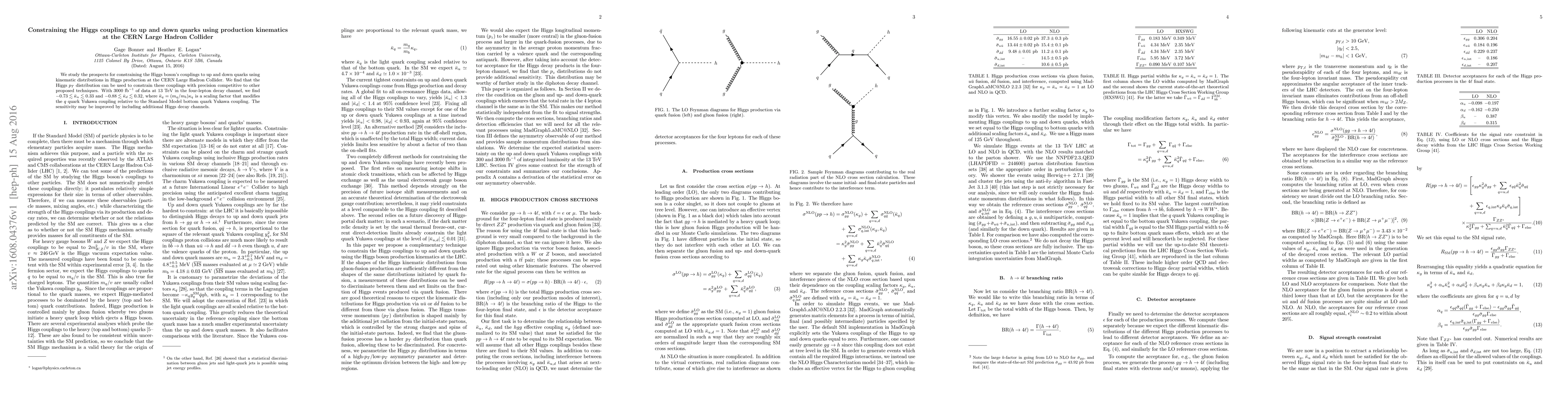 We study the prospects for constraining the Higgs boson's couplings to up and down quarks using kinematic distributions in Higgs production at the CERN Large Hadron Collider. We find that the Higgs $p_T$ distribution can be used to constrain these couplings with precision competitive to other proposed techniques. With 3000 fb$^{-1}$ of data at 13 TeV in the four-lepton decay channel, we find $-0.73 \lesssim \bar{\kappa}_u \lesssim 0.33$ and $-0.88 \lesssim \bar{\kappa}_d \lesssim 0.32$, where $\bar{\kappa}_q = (m_q/m_b) \kappa_q$ is a scaling factor that modifies the $q$ quark Yukawa coupling relative to the Standard Model bottom quark Yukawa coupling. The sensitivity may be improved by including additional Higgs decay channels.