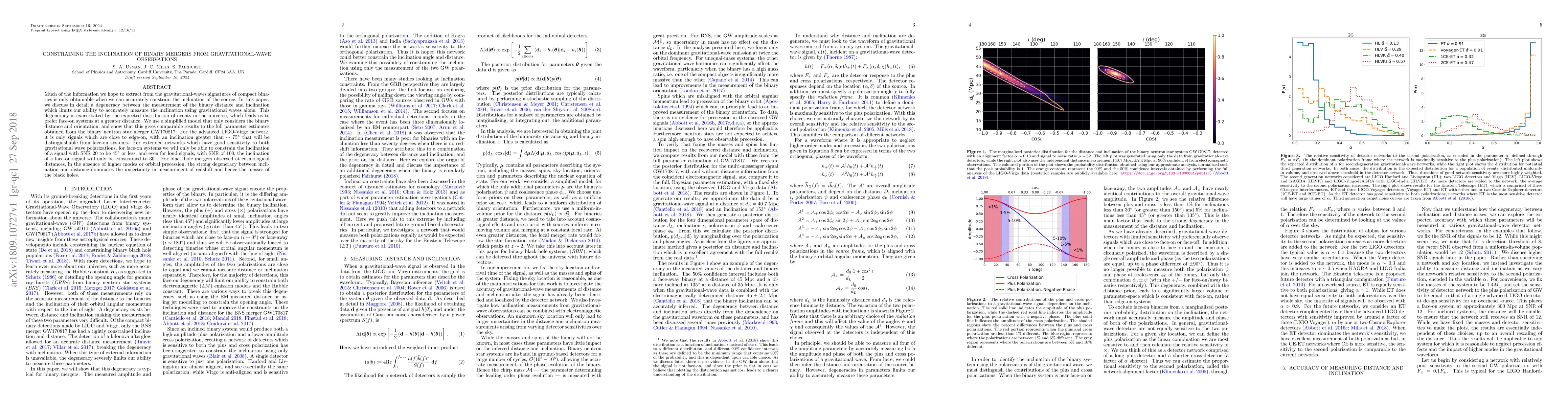 This paper discusses the challenge of accurately measuring the inclination of binary mergers from gravitational-wave observations, highlighting a significant degeneracy between distance and inclination. It concludes that only edge-on mergers with high inclinations can be distinguished, while face-on systems remain largely indistinguishable, especially for extended networks.