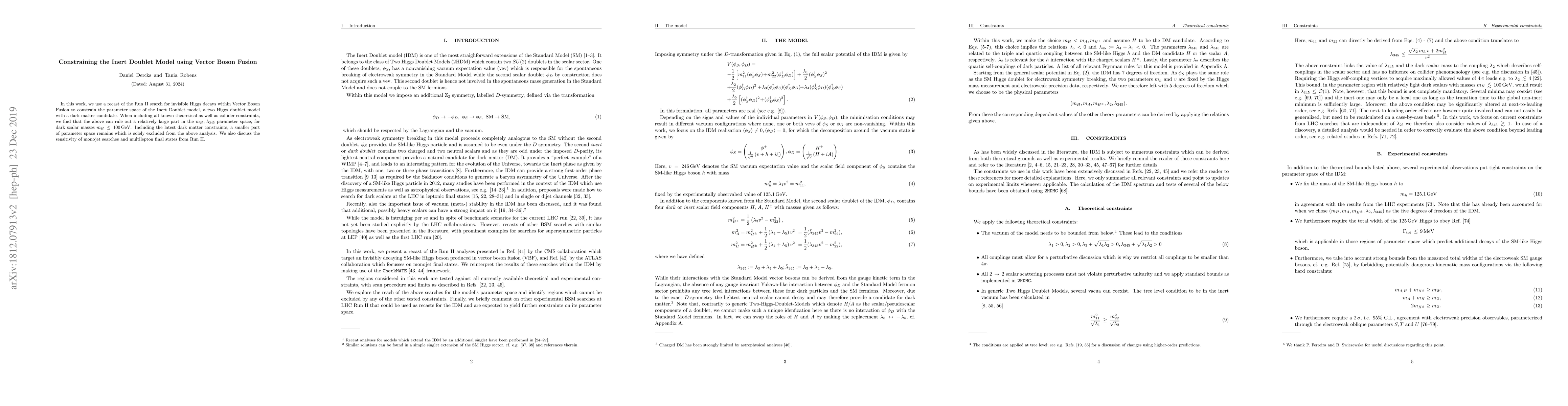 This paper constrains the Inert Doublet Model using Vector Boson Fusion data from Run II, ruling out a significant portion of the mH-lambda345 parameter space for dark scalar masses up to 100 GeV. Additional dark matter constraints further reduce the remaining viable parameter space.