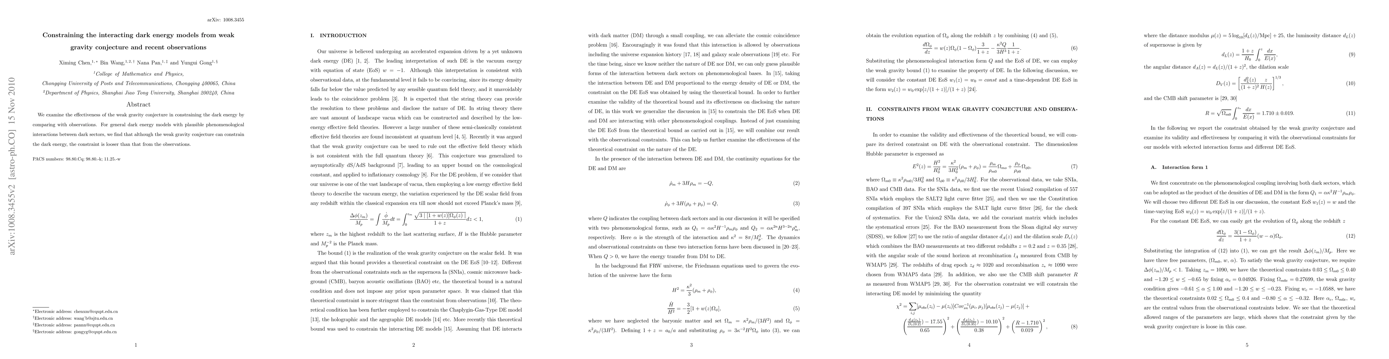 Summary: This study assesses how the weak gravity conjecture restricts interacting dark energy models, finding that while it provides some constraints, they are less stringent compared to those derived from recent observational data.