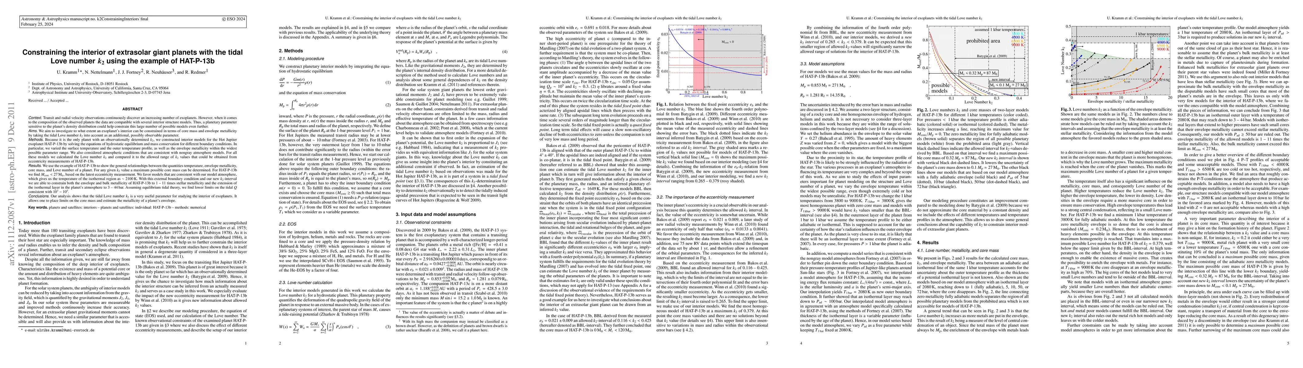Transit and radial velocity observations continuously discover an increasing number of exoplanets. However, when it comes to the composition of the observed planets the data are compatible with several interior structure models. Thus, a planetary parameter sensitive to the planet's density distribution could help constrain this large number of possible models even further. We aim to investigate to what extent an exoplanet's interior can be constrained in terms of core mass and envelope metallicity by taking the tidal Love number k_2 into account as an additional possibly observable parameter. Because it is the only planet with an observationally determined k_2, we constructed interior models for the Hot Jupiter exoplanet HAT-P-13b by solving the equations of hydrostatic equilibrium and mass conservation for different boundary conditions. In particular, we varied the surface temperature and the outer temperature profile, as well as the envelope metallicity within the widest possible parameter range. We also considered atmospheric conditions that are consistent with nongray atmosphere models. For all these models we calculated the Love number k_2 and compared it to the allowed range of k_2 values that could be obtained from eccentricity measurements of HAT-P-13b. We use the example of HAT-P-13b to show the general relationships between the quantities temperature, envelope metallicity, core mass, and Love number of a planet. For any given k_2 value a maximum possible core mass can be determined. For HAT-P-13b we find Mcore < 27 ME, based on the latest eccentricity measurement. We are able to constrain both the envelope and bulk metallicity of HAT-P-13b to 1 -- 11 times stellar metallicity and the extension of the isothermal layer in the planet's atmosphere to 3 -- 44 bar. Assuming equilibrium tidal theory, we find lower limits on the tidal Q consistent with 10^3 - 10^5.