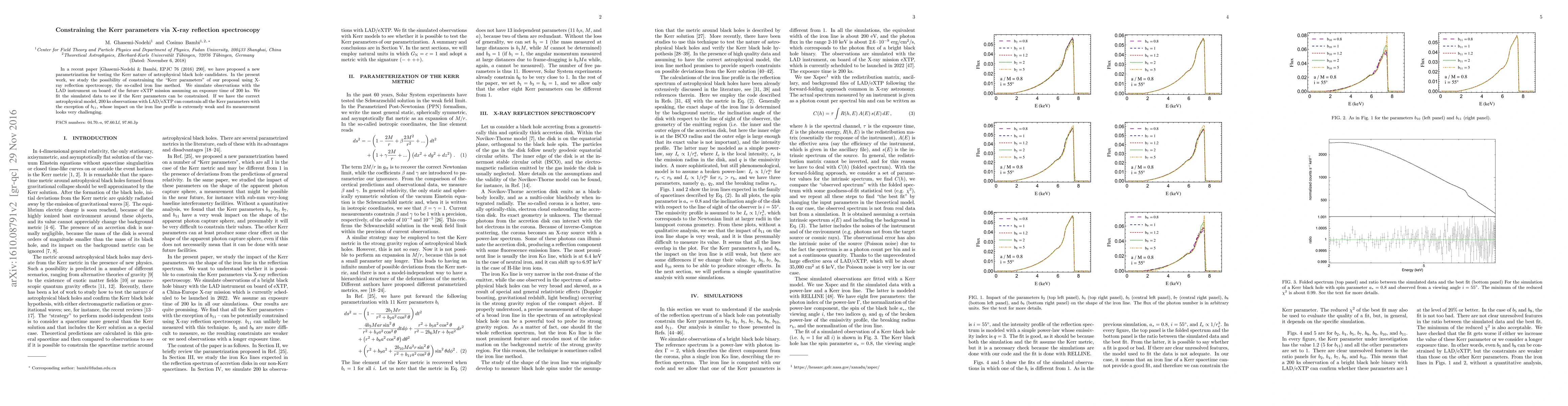 This paper explores the potential of X-ray reflection spectroscopy, specifically the iron line method, to constrain the "Kerr parameters" proposed in a previous study for testing the Kerr nature of black holes. Simulations using the LAD instrument on the future eXTP mission suggest that 200 ks observations can constrain all Kerr parameters except $b_{11}$, due to its weak influence on the iron line profile.