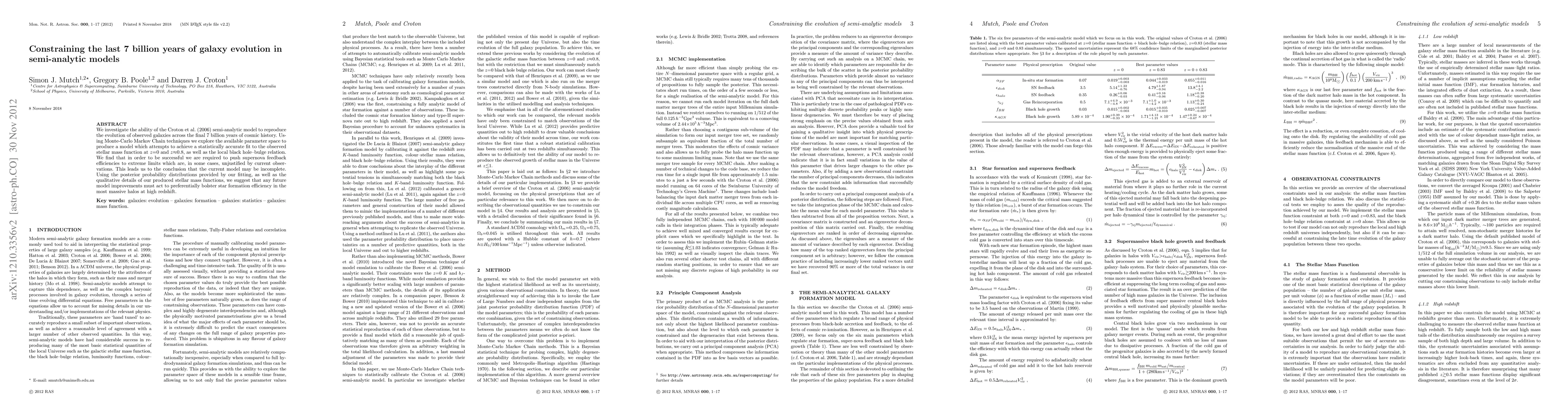 We investigate the ability of the Croton et al. (2006) semi-analytic model to reproduce the evolution of observed galaxies across the final 7 billion years of cosmic history. Using Monte-Carlo Markov Chain techniques we explore the available parameter space to produce a model which attempts to achieve a statistically accurate fit to the observed stellar mass function at z=0 and z~0.8, as well as the local black hole-bulge relation. We find that in order to be successful we are required to push supernova feedback efficiencies to extreme limits which are, in some cases, unjustified by current observations. This leads us to the conclusion that the current model may be incomplete. Using the posterior probability distributions provided by our fitting, as well as the qualitative details of our produced stellar mass functions, we suggest that any future model improvements must act to preferentially bolster star formation efficiency in the most massive halos at high redshift.