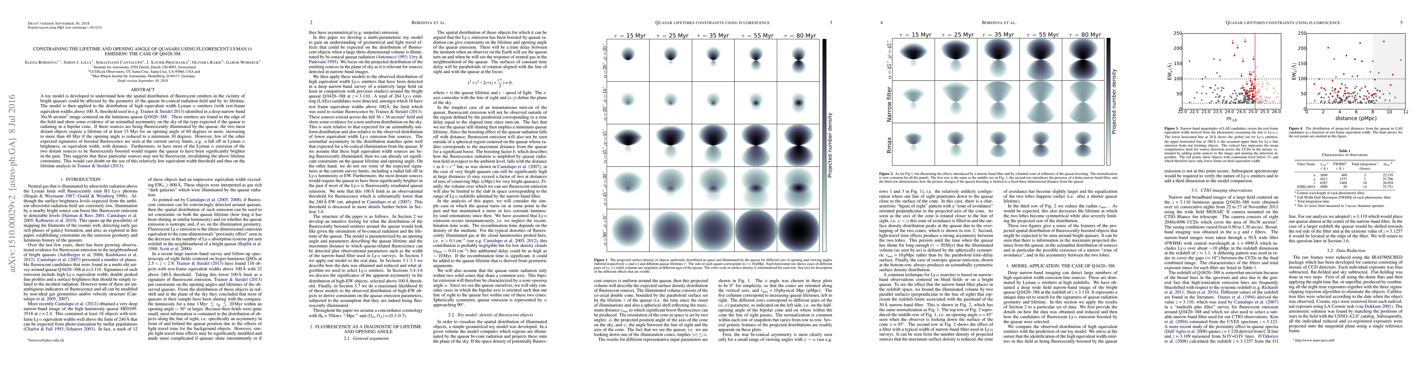 A toy model is developed to understand how the spatial distribution of fluorescent emitters in the vicinity of bright quasars could be affected by the geometry of the quasar bi-conical radiation field and by its lifetime. The model is then applied to the distribution of high equivalent width Lyman $\alpha$ emitters (with rest-frame equivalent widths above 100 A, threshold used in e.g. Trainor & Steidel, 2013) identified in a deep narrow-band 36x36 arcmin$^2$ image centered on the luminous quasar Q0420-388. These emitters are found to the edge of the field and show some evidence of an azimuthal asymmetry on the sky of the type expected if the quasar is radiating in a bipolar cone. If these sources are being fluorescently illuminated by the quasar, the two most distant objects require a lifetime of at least 15 Myr for an opening angle of 60 degrees or more, increasing to more than 40 Myr if the opening angle is reduced to a minimum 30 degrees. However, few of the other expected signatures of boosted fluorescence are seen at the current survey limits, e.g. a fall off in Lyman $\alpha$ brightness, or equivalent width, with distance. Furthermore, to have most of the Lyman $\alpha$ emission of the two distant sources to be fluorescently boosted would require the quasar to have been significantly brighter in the past. This suggests that these particular sources may not be fluorescent, invalidating the above lifetime constraints. This would cast doubt on the use of this relatively low equivalent width threshold and thus on the lifetime analysis in Trainor & Steidel (2013).
