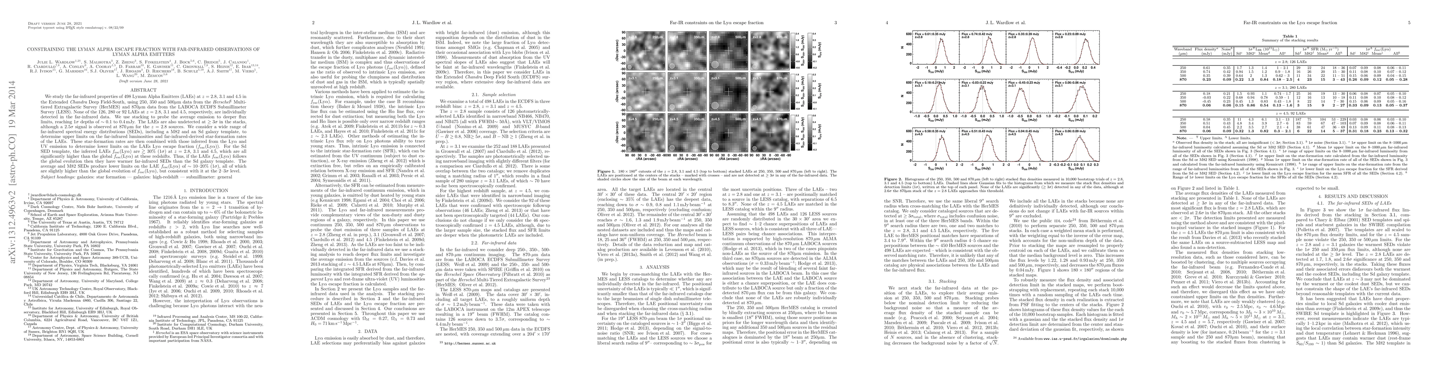 We study the far-infrared properties of 498 Lyman Alpha Emitters (LAEs) at z=2.8, 3.1 and 4.5 in the Extended Chandra Deep Field-South, using 250, 350 and 500 micron data from the Herschel Multi-tiered Extragalactic Survey (HerMES) and 870 micron data from the LABOCA ECDFS Submillimeter Survey (LESS). None of the 126, 280 or 92 LAEs at z=2.8, 3.1 and 4.5, respectively, are individually detected in the far-infrared data. We use stacking to probe the average emission to deeper flux limits, reaching $1\sigma$ depths of ~0.1 to 0.4 mJy. The LAEs are also undetected at $\ge3\sigma$ in the stacks, although a $2.5\sigma$ signal is observed at 870 micron for the z=2.8 sources. We consider a wide range of far-infrared spectral energy distributions (SEDs), including a M82 and an Sd galaxy template, to determine upper limits on the far-infrared luminosities and far-infrared-derived star-formation rates of the LAEs. These star-formation rates are then combined with those inferred from the Ly$\alpha$ and UV emission to determine lower limits on the LAEs Ly$\alpha$ escape fraction ($f_{\rm esc}($Ly$\alpha$)). For the Sd SED template, the inferred LAEs $f_{\rm esc}($Ly$\alpha$) are $\gtrsim30%$ ($1\sigma$) at z=2.8, 3.1 and 4.5, which are all significantly higher than the global $f_{\rm esc}($Ly$\alpha$) at these redshifts. Thus, if the LAEs $f_{\rm esc}($Ly$\alpha$) follows the global evolution then they have warmer far-infrared SEDs than the Sd galaxy template. The average and M82 SEDs produce lower limits on the LAE $f_{\rm esc}($Ly$\alpha$) of ~10 to 20% ($1\sigma$), all of which are slightly higher than the global evolution of $f_{\rm esc}($Ly$\alpha$) but consistent with it at the 2 to 3$\sigma$ level.