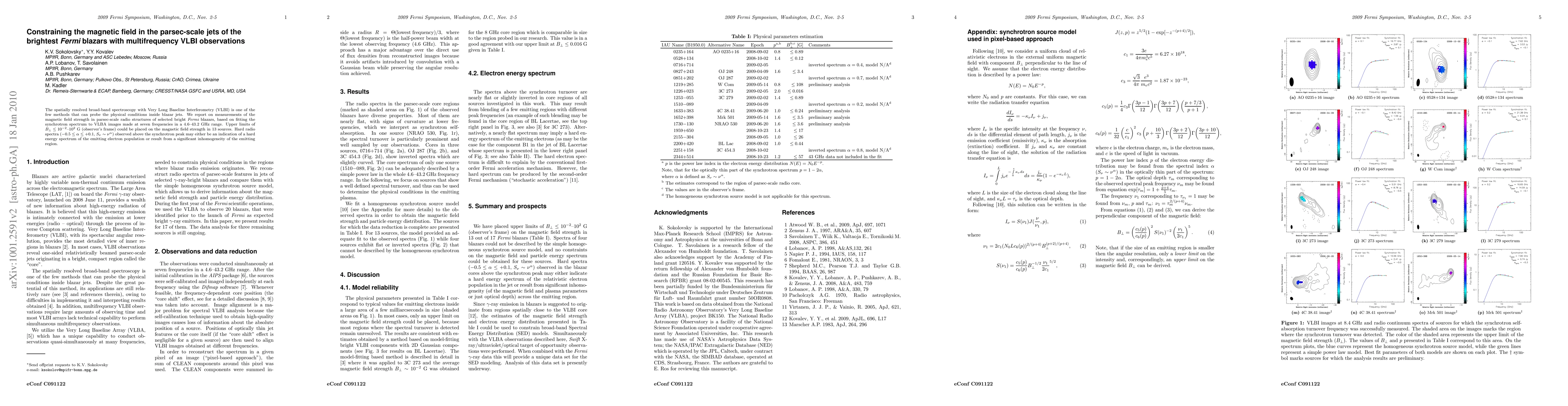This study uses multifrequency VLBI observations to measure the magnetic field strength in parsec-scale jets of bright Fermi blazars, finding upper limits of B ≤ 10^-2 -- 10^2 G. The hard radio spectra observed may suggest a hard energy spectrum of emitting electrons or inhomogeneity in the jet region.