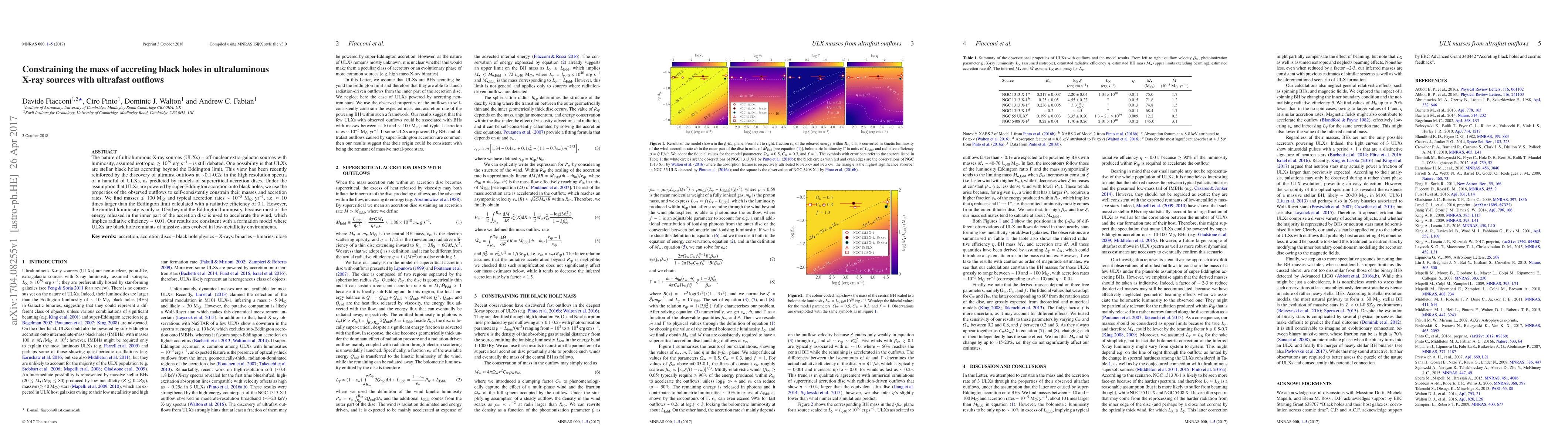 The nature of ultraluminous X-ray sources (ULXs) -- off-nuclear extra-galactic sources with luminosity, assumed isotropic, $\gtrsim 10^{39}$ erg s$^{-1}$ -- is still debated. One possibility is that ULXs are stellar black holes accreting beyond the Eddington limit. This view has been recently reinforced by the discovery of ultrafast outflows at $\sim 0.1$-$0.2c$ in the high resolution spectra of a handful of ULXs, as predicted by models of supercritical accretion discs. Under the assumption that ULXs are powered by super-Eddington accretion onto black holes, we use the properties of the observed outflows to self-consistently constrain their masses and accretion rates. We find masses $\lesssim 100$ M$_{\odot}$ and typical accretion rates $\sim 10^{-5}$ M$_{\odot}$ yr$^{-1}$, i.e. $\approx 10$ times larger than the Eddington limit calculated with a radiative efficiency of 0.1. However, the emitted luminosity is only $\approx 10\%$ beyond the Eddington luminosity, because most of the energy released in the inner part of the accretion disc is used to accelerate the wind, which implies radiative efficiency $\sim 0.01$. Our results are consistent with a formation model where ULXs are black hole remnants of massive stars evolved in low-metallicity environments.