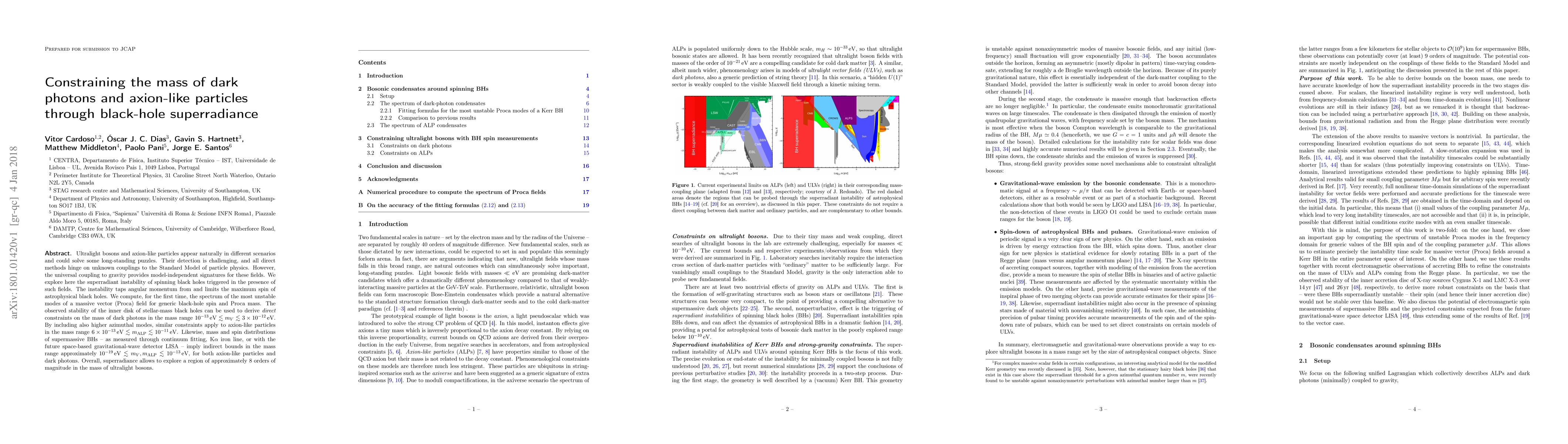 Ultralight bosons and axion-like particles appear naturally in different scenarios and could solve some long-standing puzzles. Their detection is challenging, and all direct methods hinge on unknown couplings to the Standard Model of particle physics. However, the universal coupling to gravity provides model-independent signatures for these fields. We explore here the superradiant instability of spinning black holes triggered in the presence of such fields. The instability taps angular momentum from and limits the maximum spin of astrophysical black holes. We compute, for the first time, the spectrum of the most unstable modes of a massive vector (Proca) field for generic black-hole spin and Proca mass. The observed stability of the inner disk of stellar-mass black holes can be used to derive \emph{direct} constraints on the mass of dark photons in the mass range $ 10^{-13}\,{\rm eV}\lesssim m_V \lesssim 3\times 10^{-12}\,{\rm eV}$. By including also higher azimuthal modes, similar constraints apply to axion-like particles in the mass range $6\times10^{-13}\,{\rm eV}\lesssim m_{\rm ALP} \lesssim 10^{-11}\, {\rm eV}$. Likewise, mass and spin distributions of supermassive BHs --~as measured through continuum fitting, K$\alpha$ iron line, or with the future space-based gravitational-wave detector LISA~-- imply indirect bounds in the mass range approximately $10^{-19}\,{\rm eV}\lesssim m_V, m_{\rm ALP} \lesssim 10^{-13}\, {\rm eV}$, for both axion-like particles and dark photons. Overall, superradiance allows to explore a region of approximately $8$ orders of magnitude in the mass of ultralight bosons.