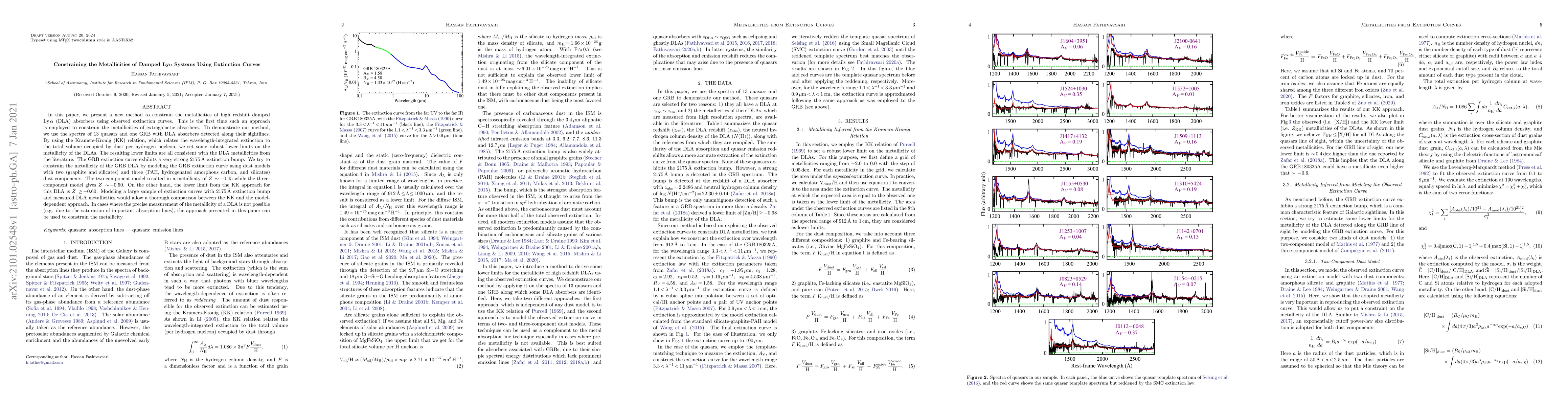 In this paper, we present a new method to constrain the metallicities of high redshift damped Ly$\alpha$ (DLA) absorbers using observed extinction curves. This is the first time such an approach is employed to constrain the metallicities of extragalactic absorbers. To demonstrate our method, we use the spectra of 13 quasars and one GRB with DLA absorbers detected along their sightlines. By using the Kramers-Kronig (KK) relation, which relates the wavelength-integrated extinction to the total volume occupied by dust per hydrogen nucleon, we set some robust lower limits on the metallicity of the DLAs. The resulting lower limits are all consistent with the DLA metallicities from the literature. The GRB extinction curve exhibits a very strong 2175 A extinction bump. We try to constrain the metallicity of the GRB DLA by modeling the GRB extinction curve using dust models with two (graphite and silicates) and three (PAH, hydrogenated amorphous carbon, and silicates) dust components. The two-component model resulted in a metallicity of $Z\sim$$-$0.45 while the three-component model gives $Z\sim$$-$0.50. On the other hand, the lower limit from the KK approach for this DLA is $Z\ge$$-$0.60. Modeling a large sample of extinction curves with 2175 A extinction bump and measured DLA metallicities would allow a thorough comparison between the KK and the model-dependent approach. In cases where the precise measurement of the metallicity of a DLA is not possible (e.g. due to the saturation of important absorption lines), the approach presented in this paper can be used to constrain the metallicity.