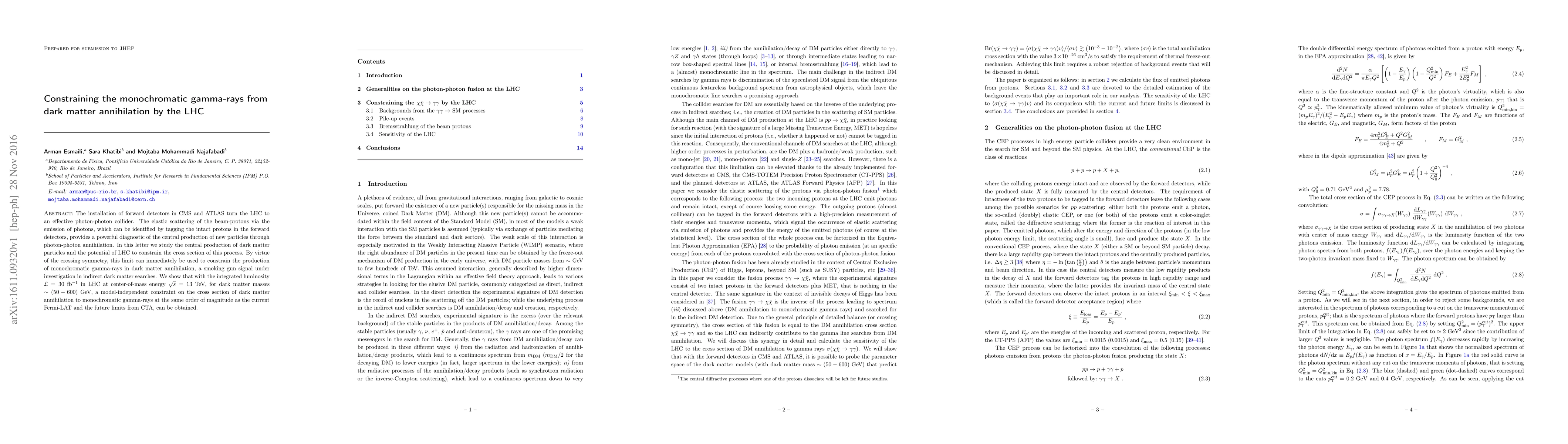 This paper investigates the potential of the LHC to constrain the production of monochromatic gamma-rays from dark matter annihilation using forward detectors in CMS and ATLAS. With an integrated luminosity of 30 fb$^{-1}$ at 13 TeV, the LHC can provide model-independent constraints on the cross section of dark matter annihilation to gamma-rays, comparable to current Fermi-LAT and future CTA limits.