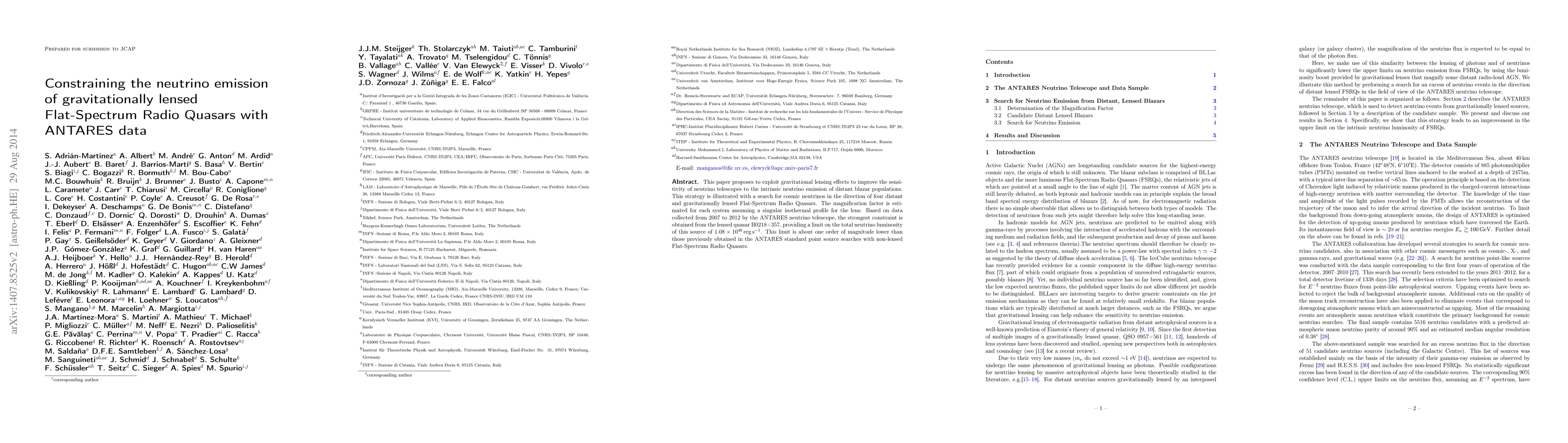 This paper uses gravitational lensing to enhance neutrino telescope sensitivity for detecting neutrino emissions from distant blazars, specifically focusing on four lensed Flat-Spectrum Radio Quasars. The ANTARES telescope data from 2007 to 2012 yielded the strongest constraint on the neutrino luminosity of B0218+357, achieving a limit one order of magnitude lower than previous non-lensed searches.