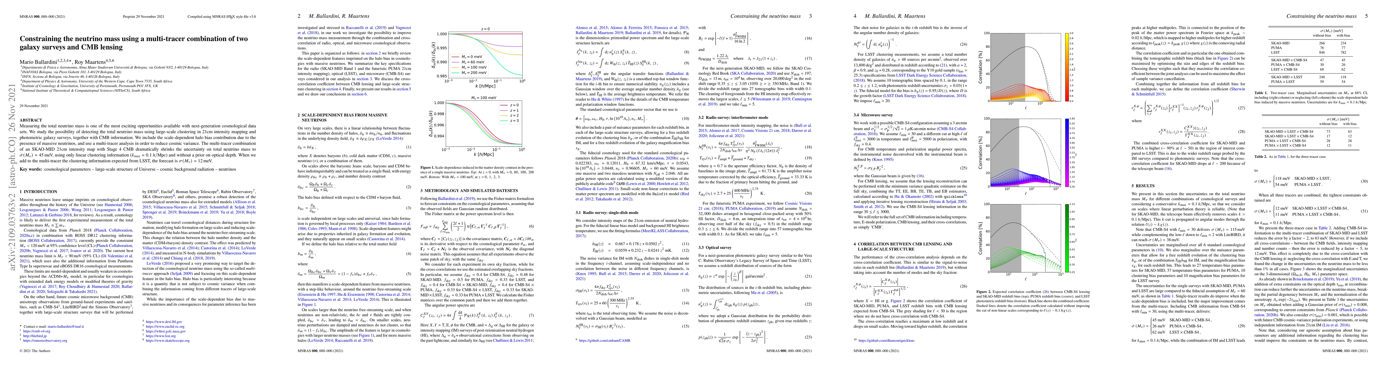 This paper explores the detection of total neutrino mass using a combination of 21cm intensity mapping and photometric galaxy surveys, alongside CMB lensing data. The multi-tracer approach significantly reduces the uncertainty to $\sigma(M_\nu) \simeq 45\,$meV, and further improves to $\sigma(M_\nu) \simeq 12\,$meV when including LSST clustering data.