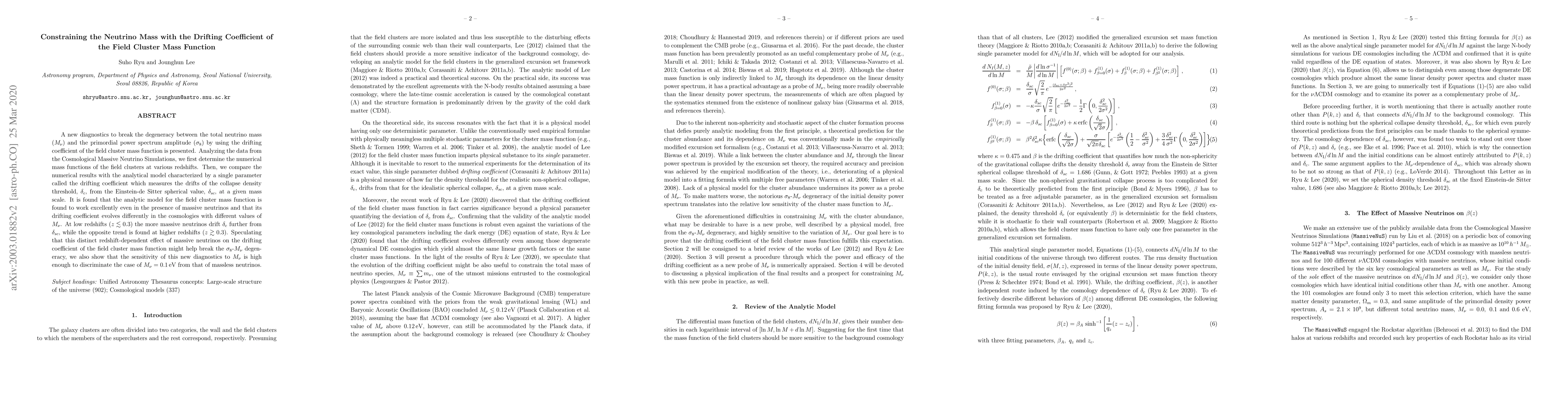A new diagnostics to break the degeneracy between the total neutrino mass ($M_{\nu}$) and the primordial power spectrum amplitude ($\sigma_{8}$) by using the drifting coefficient of the field cluster mass function is presented. Analyzing the data from the Cosmological Massive Neutrino Simulations, we first determine the numerical mass functions of the field clusters at various redshifts. Then, we compare the numerical results with the analytical model characterized by a single parameter called the drifting coefficient which measures the drifts of the collapse density threshold, $\delta_{c}$, from the Einstein-de Sitter spherical value, $\delta_{sc}$, at a given mass scale. It is found that the analytic model for the field cluster mass function is found to work excellently even in the presence of massive neutrinos and that its drifting coefficient evolves differently in the cosmologies with different values of $M_{\nu}$. At low redshifts ($z\lesssim 0.3$) the more massive neutrinos drift $\delta_{c}$ further from $\delta_{sc}$, while the opposite trend is found at higher redshifts ($z\gtrsim0.3$). Speculating that this distinct redshift-dependent effect of massive neutrinos on the drifting coefficient of the field cluster mass function might help break the $\sigma_{8}$-$M_{\nu}$ degeneracy, we also show that the sensitivity of this new diagnostics to $M_{\nu}$ is high enough to discriminate the case of $M_{\nu}=0.1\,{\rm eV}$ from that of massless neutrinos.