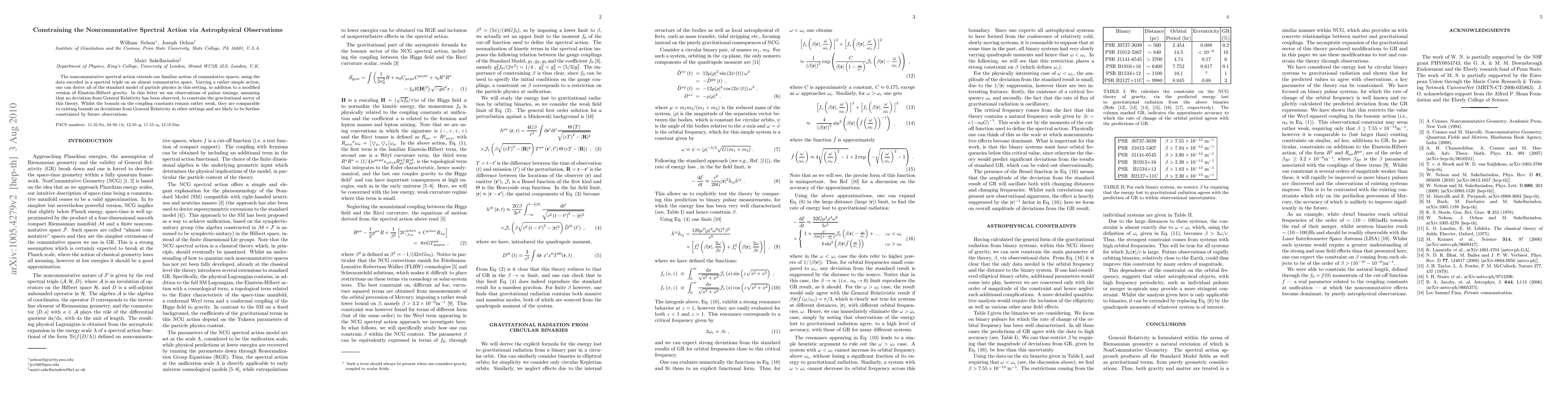 The noncommutative spectral action extends our familiar notion of commutative spaces, using the data encoded in a spectral triple on an almost commutative space. Varying a rather simple action, one can derive all of the standard model of particle physics in this setting, in addition to a modified version of Einstein-Hilbert gravity. Thus, noncommutative geometry provides a geometric interpretation of particle physics coupled to curvature. In this letter we use observations of pulsar timings, assuming that no deviation from General Relativity has been observed, to constrain the gravitational sector of this theory. Thus, we directly constrain noncommutative geometry, a potential grand unified theory of physics, via astrophysical observations. Whilst the bounds on the coupling constants remain rather weak, they are comparable to existing bounds on deviations from General Relativity in other settings and are likely to be further constrained by future observations.
